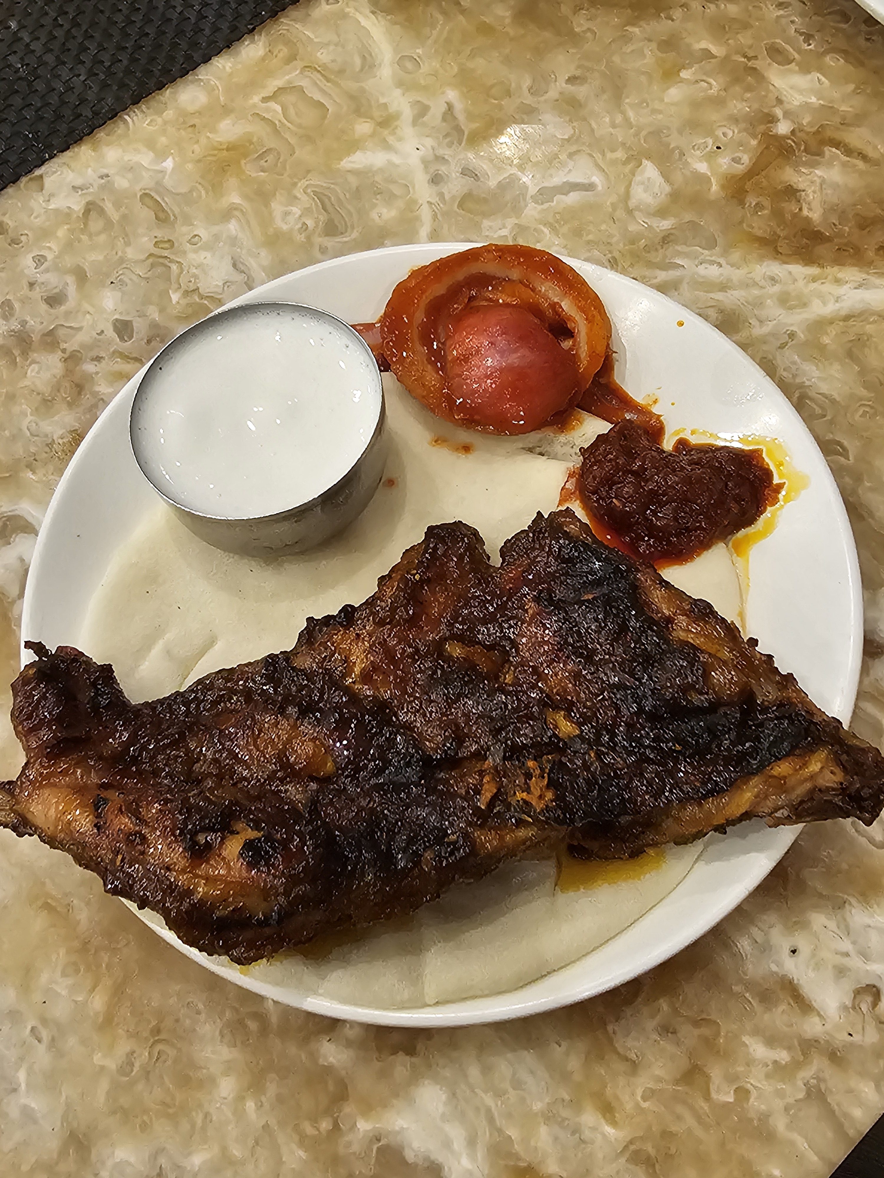 Alternative Text: A plate of Al Faham chicken, a type of grilled or barbecued chicken popular in Middle and South Asian cuisine, served with accompaniments. The chicken is seasoned with spices and herbs, giving it a reddish-brown color. It is placed on a flatbread and served with a small bowl of white sauce, a slice of tomato, and a dollop of red chutney.