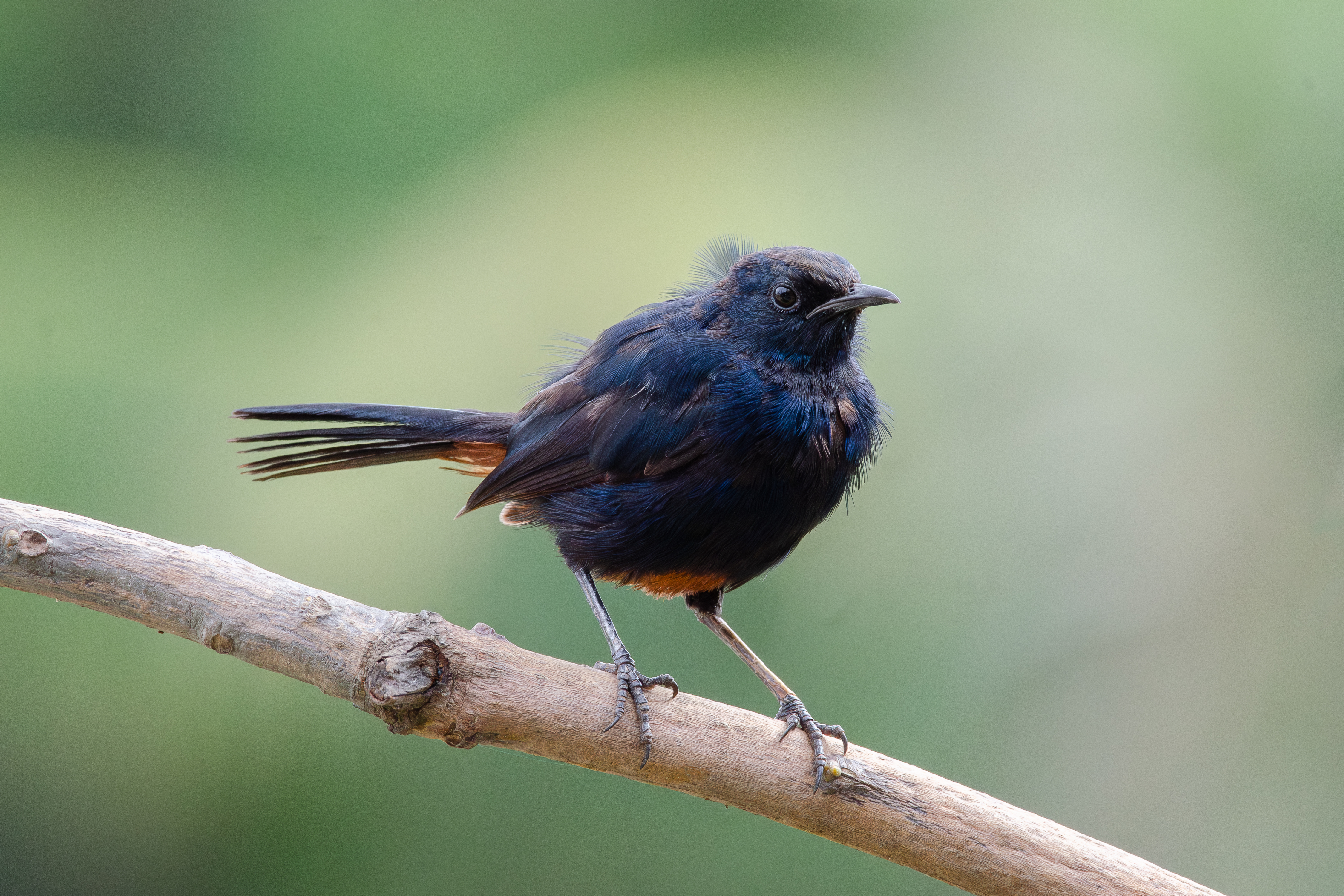 Alternative Text: A close-up image of a Indian Robin bird perched on a branch. The bird has dark blue and black feathers, with an orange hue on its underbelly. #SummerPhotoContest