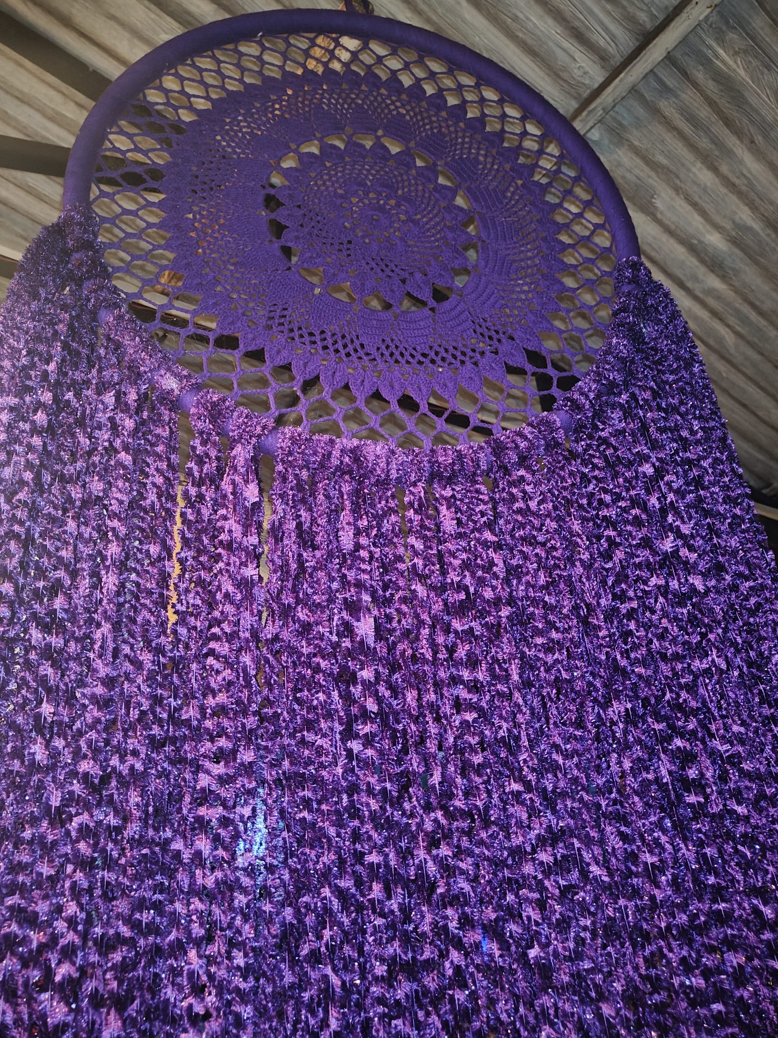 Alternative Text: A vibrant purple dream catcher hangs from a wooden ceiling, featuring an intricate crocheted circular center surrounded by cascading fringes of purple fabric