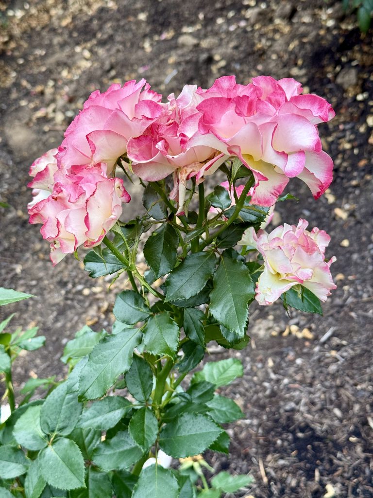 Alternative Text: A striking rose with deep pink edges and soft yellow inner petals stands out in sharp focus, with buds and green leaves all around. Taken at the International Rose Test Garden, Portland, in the evening.