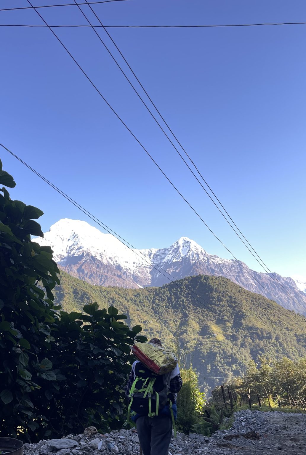 Alternative Text: A person with a backpack is walking along a gravel path, surrounded by lush greenery and large leafy plants.