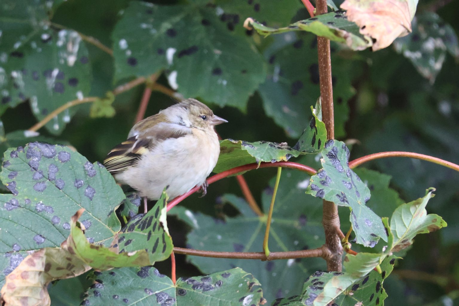 Alternative Text: A very puffed up fledgling Chaffinch likely caused by Trichomonosis sitting amongst Sycamore tree leaves blotchy with harmless Rhytisma acerinum.