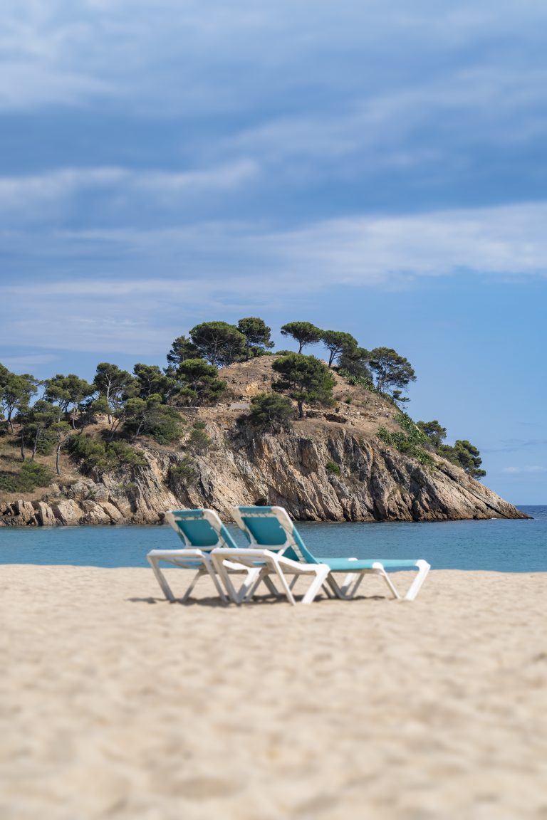 Alternative Text: Two empty sun loungers on a sandy beach facing the turquoise sea and a rocky hill with pine trees under a soft blue sky.