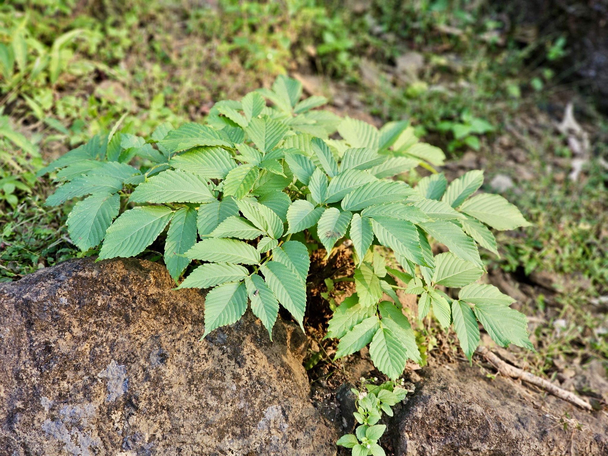Alternative Text: A green plant, possibly Leea asiatica, with large, compound, serrated leaves, grows next to a large rock in a natural outdoor setting. The plant is bushy and vibrant. Captured from near Kanheri Caves, Borivali, Mumbai.