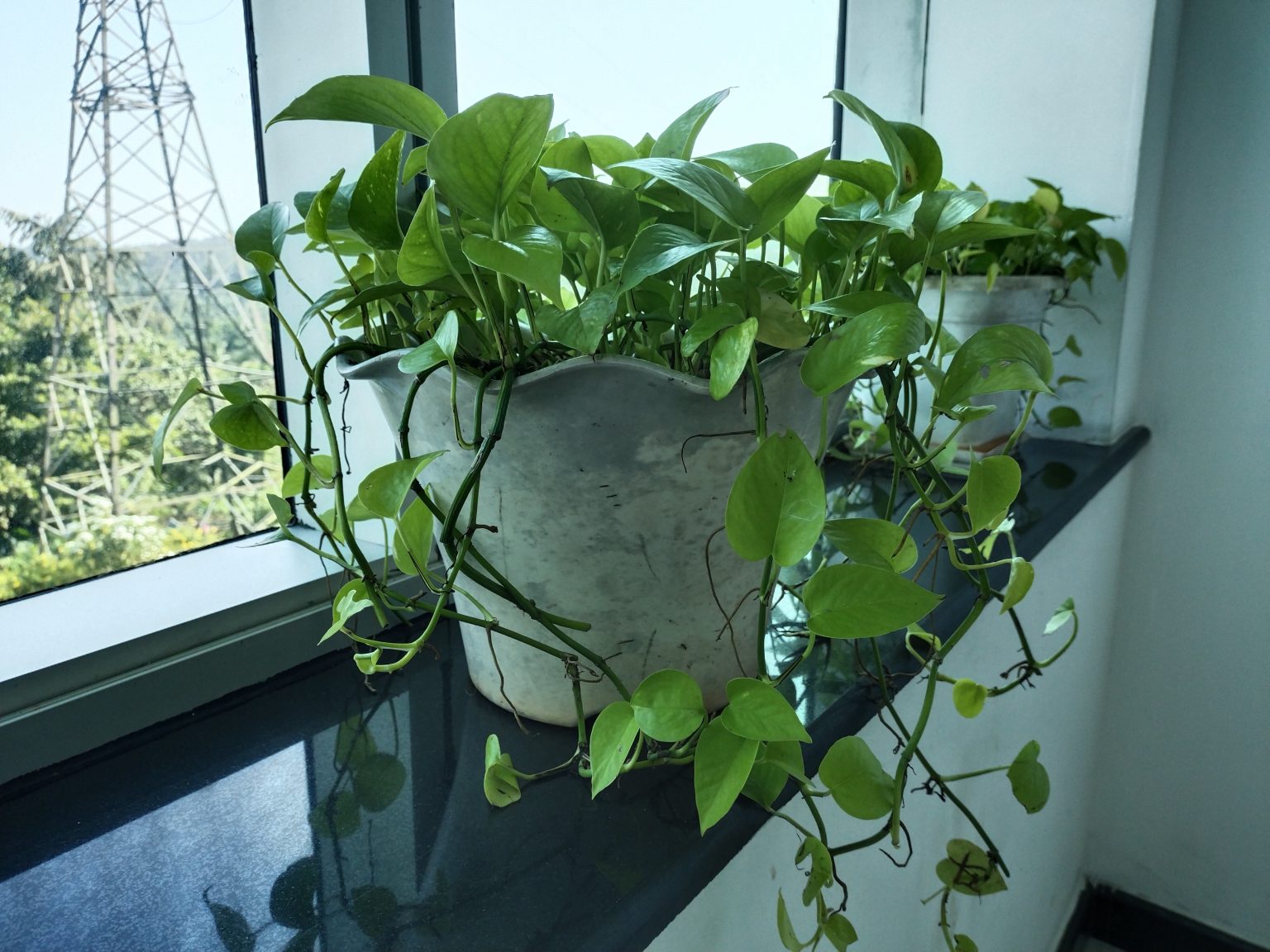 Alternative Text: An indoor plant Money plant in pot near the window.