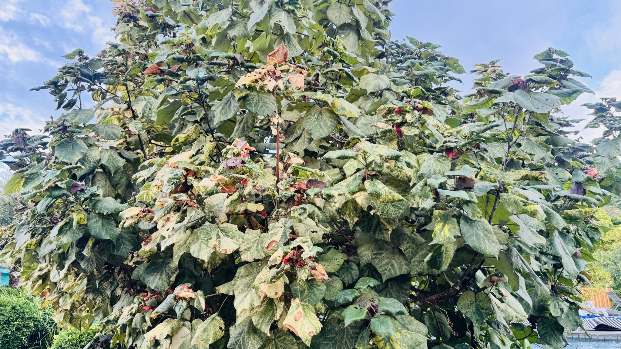 Alternative Text: A tall tree with big green leaves, some with yellow and brown spots. Its branches spread widely across a light blue sky with soft white clouds.