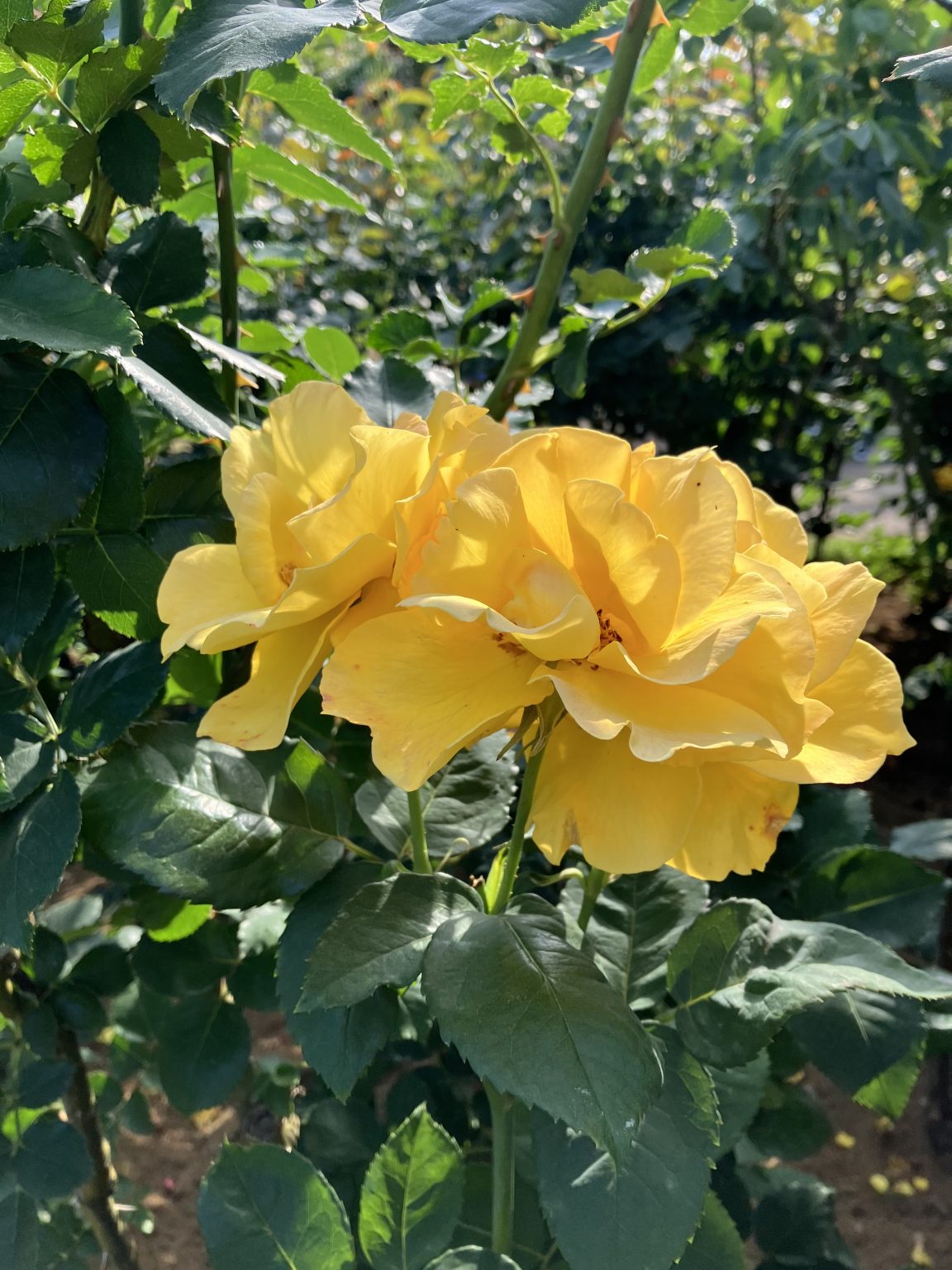 Alternative Text: Vibrant yellow roses are blooming amidst lush green foliage.