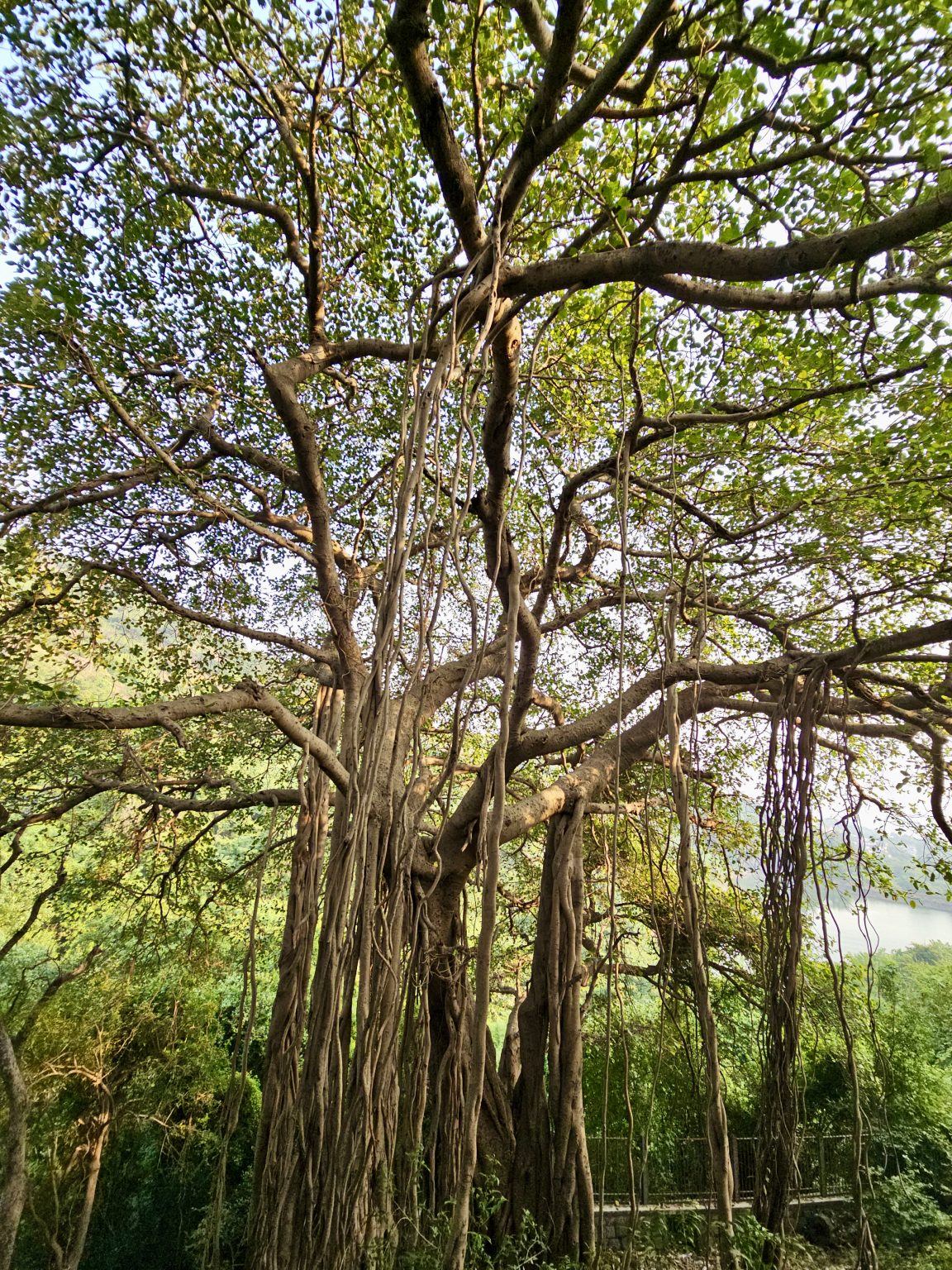 Alternative Text: A wide banyan tree with thick aerial roots hanging from sprawling branches. The lush green leaves and forest in the background add depth. Captured in natural light at Elephanta Caves, Mumbai, Maharashtra.