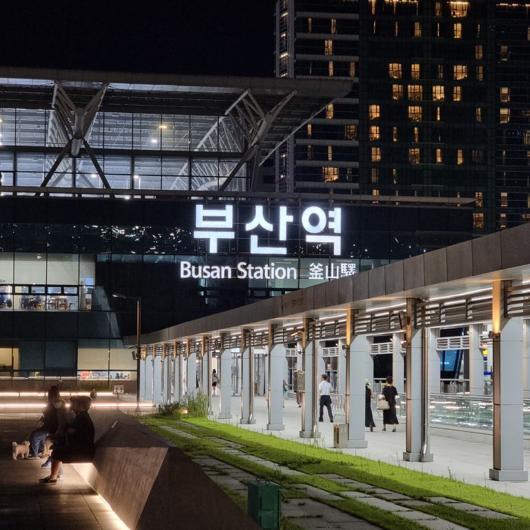 Alternative Text: Night view of the illuminated Busan Station building, showing bright signage in Korean and English, with people walking and sitting outside in a modern plaza; tall apartment buildings rise in the background