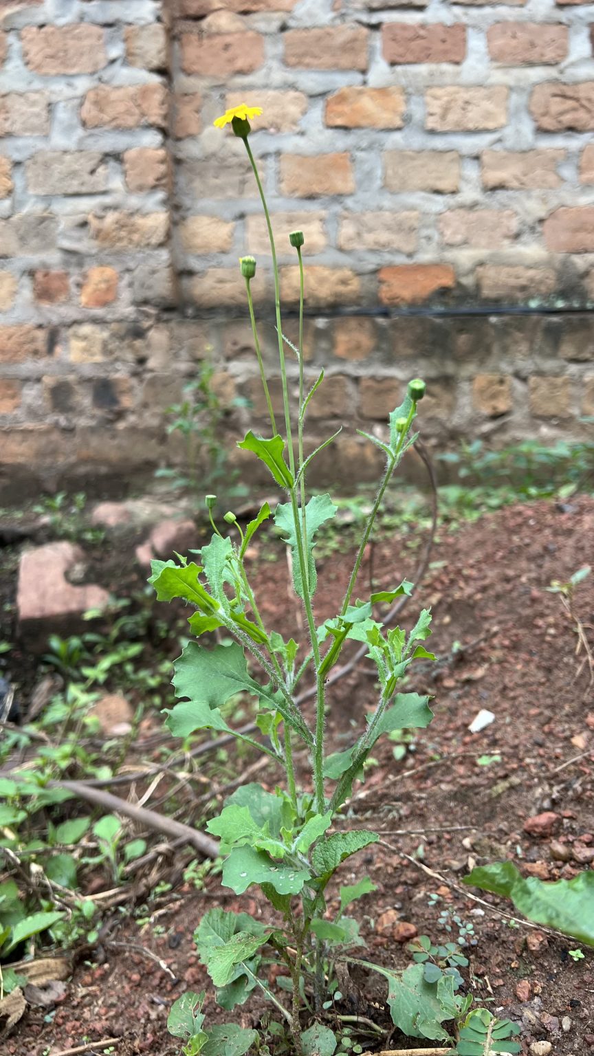 Alternative Text: A small green plant with jagged leaves and a single bright yellow flower on a slender stem stands against a textured brick wall.