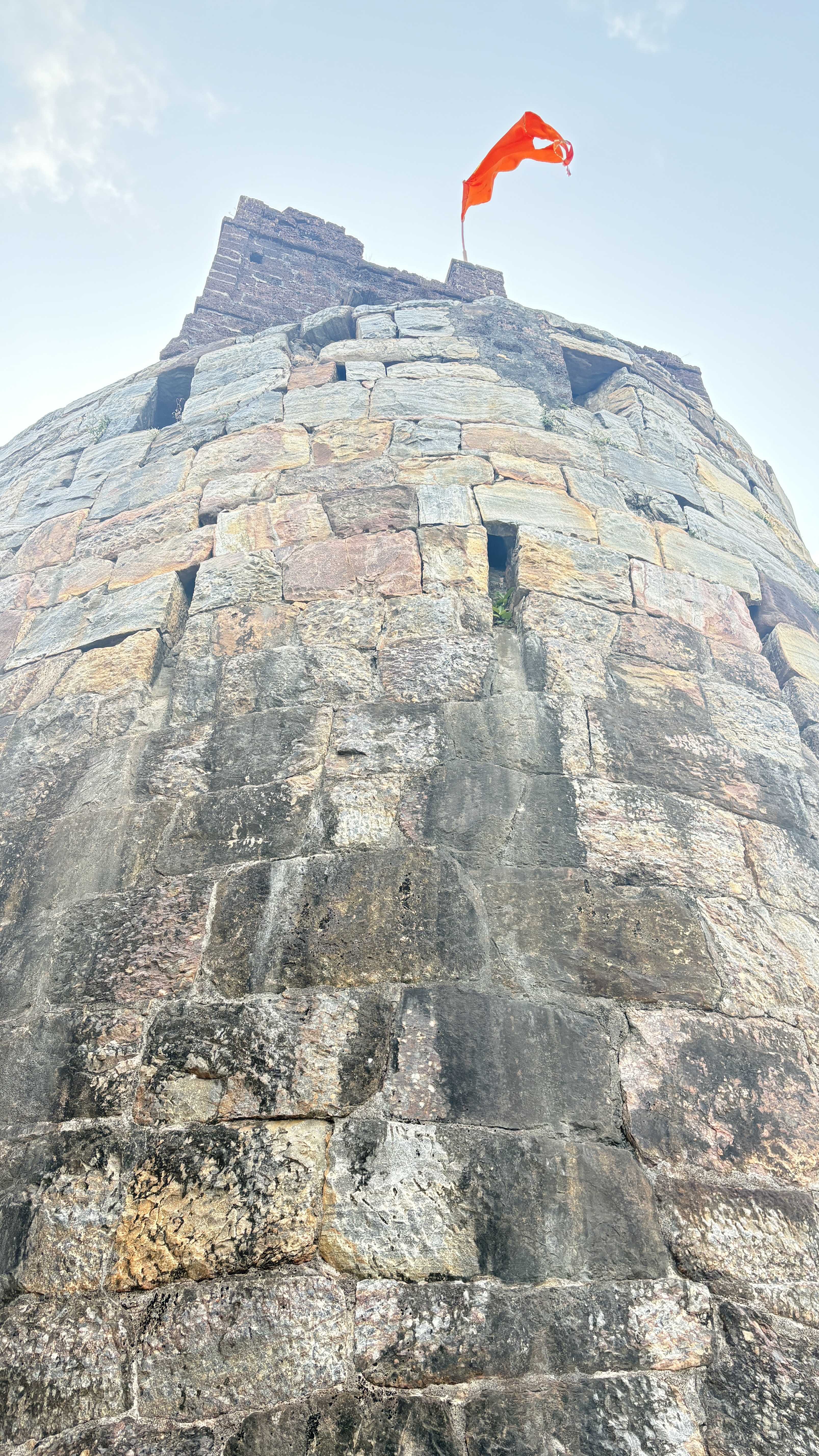 Alternative Text: A close-up view of a stone tower, showcasing rough, uneven stonework in various shades of gray and brown. At the top of the tower, a bright orange flag flutters against a pale sky