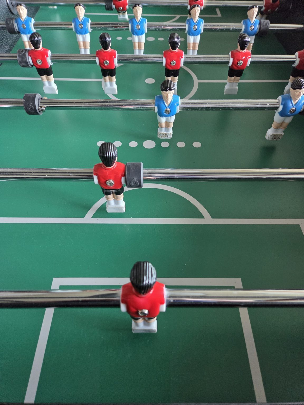 Alternative Text: A foosball table with red and blue plastic players on metal rods, set on a green field marked with white pitch lines.