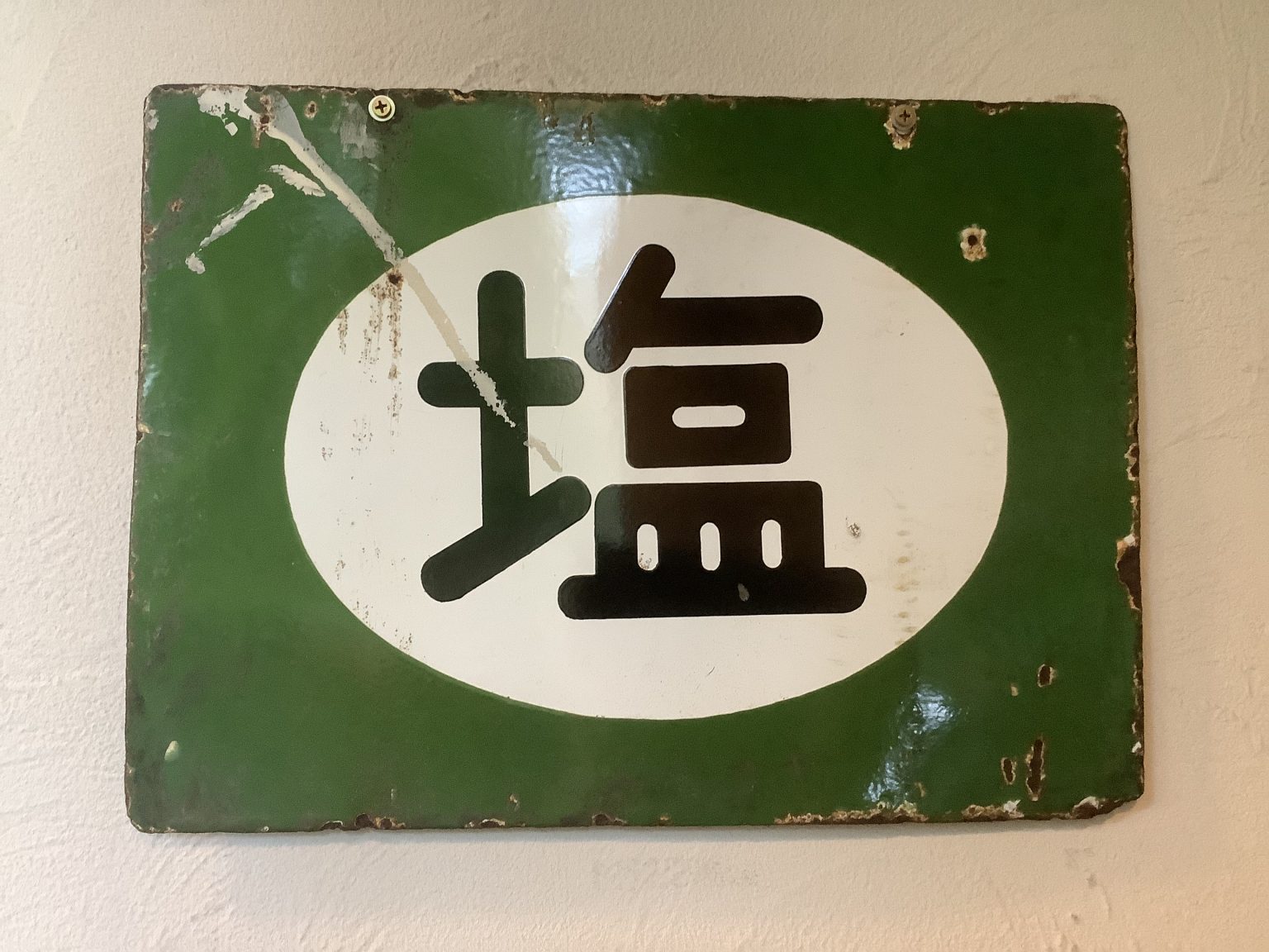 Alternative Text: Vintage Japanese salt signboard made of enamel painted metal. The metal is battered and rusty in places, sign is fixed with two top screws to a rendered wall.