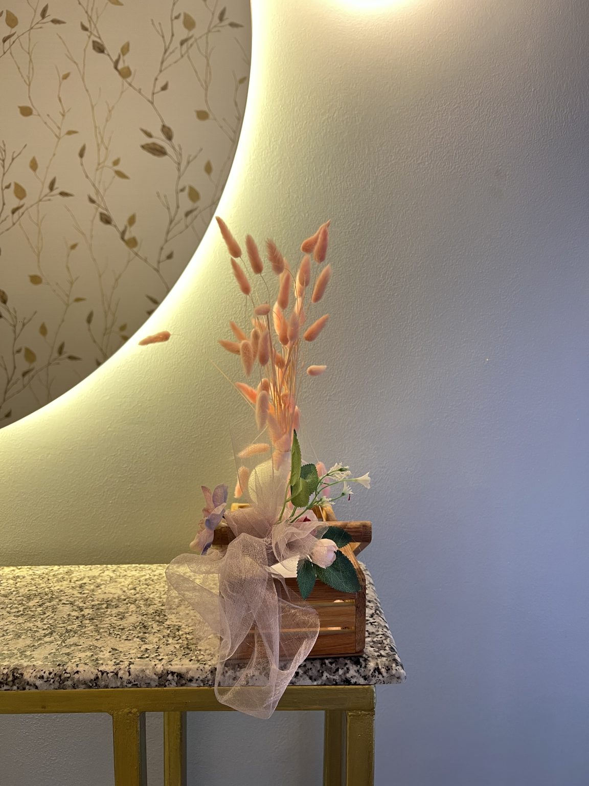 Alternative Text: A shot of a small, decorative flower arrangement in a wooden box with a pink bow, sitting on a granite countertop. A large, circular, illuminated mirror with a leafy design reflecting on it is in the background.
