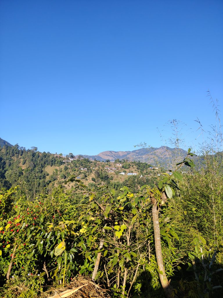 Alternative Text: A scenic view of a mountainous landscape under a clear blue sky. In the foreground, lush greenery includes various plants with bright red flowers, while the background features rolling hills and a distant settlement nestled among trees.
