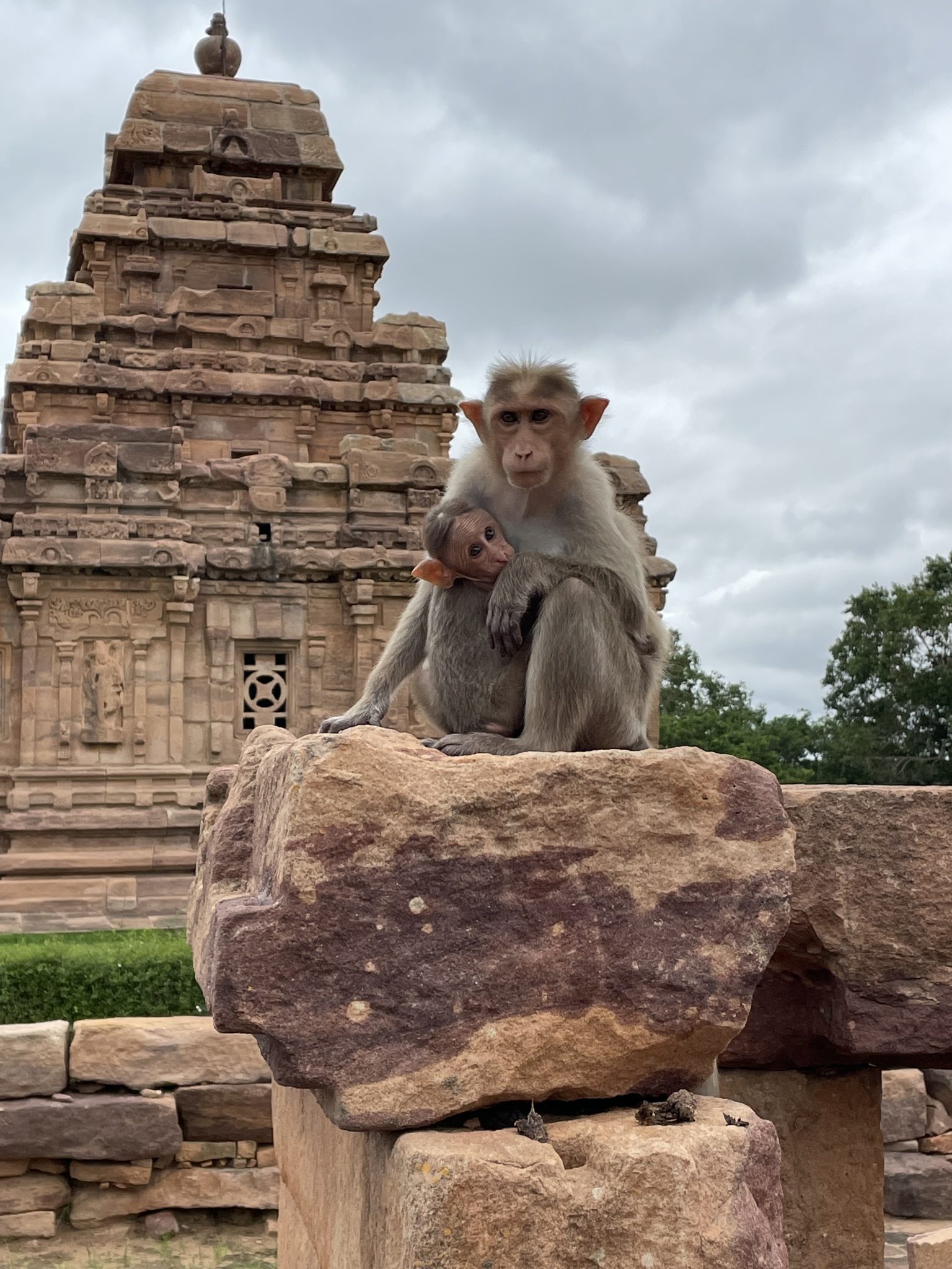 Alternative Text: A baby monkey with its mother at Pattadkal, a UNESCO World Heritage Site in Karnataka, India.