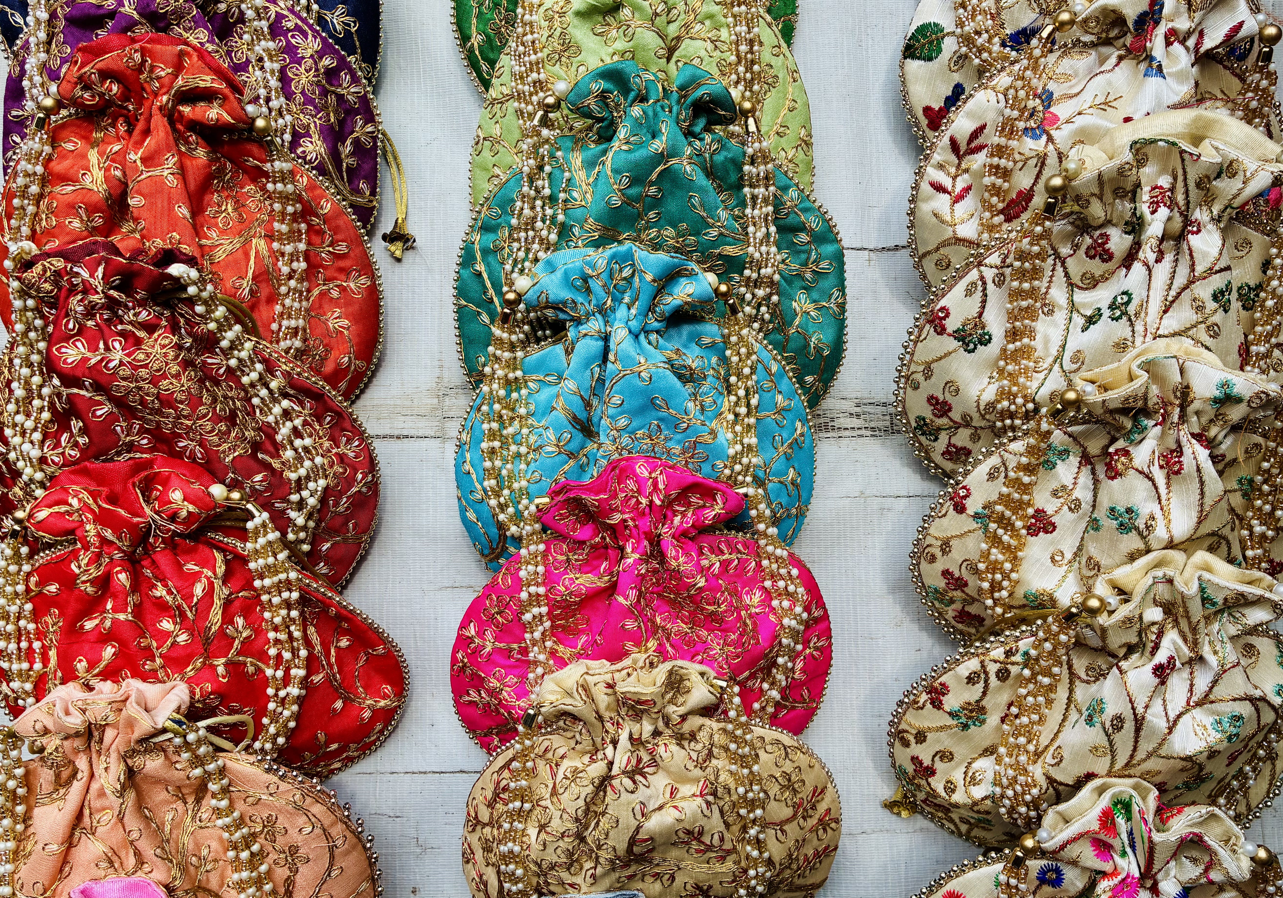 Alternative Text: A collection of small traditional Rajasthani-style bags sold in Jaipur Johari Bazar. Each bag is adorned with intricate golden embroidery and embellished with strings of pearl-like beads.