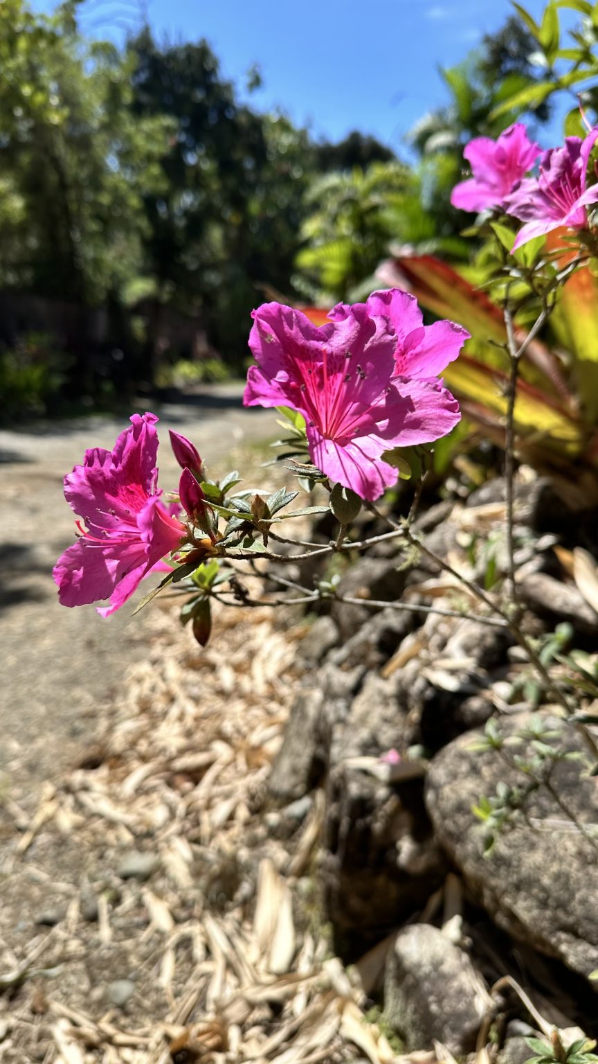 Alternative Text: Pink flowers along a path, with two in focus and a blurred background.