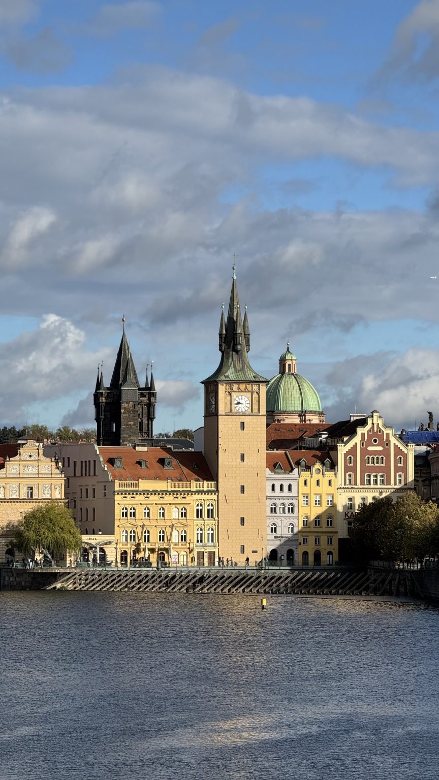 Alternative Text: View of the Old Town Water Tower and colorful historic buildings along the Vltava River in Prague, with the Charles Bridge Tower and a green dome of St. Francis Church under a partly cloudy sky.