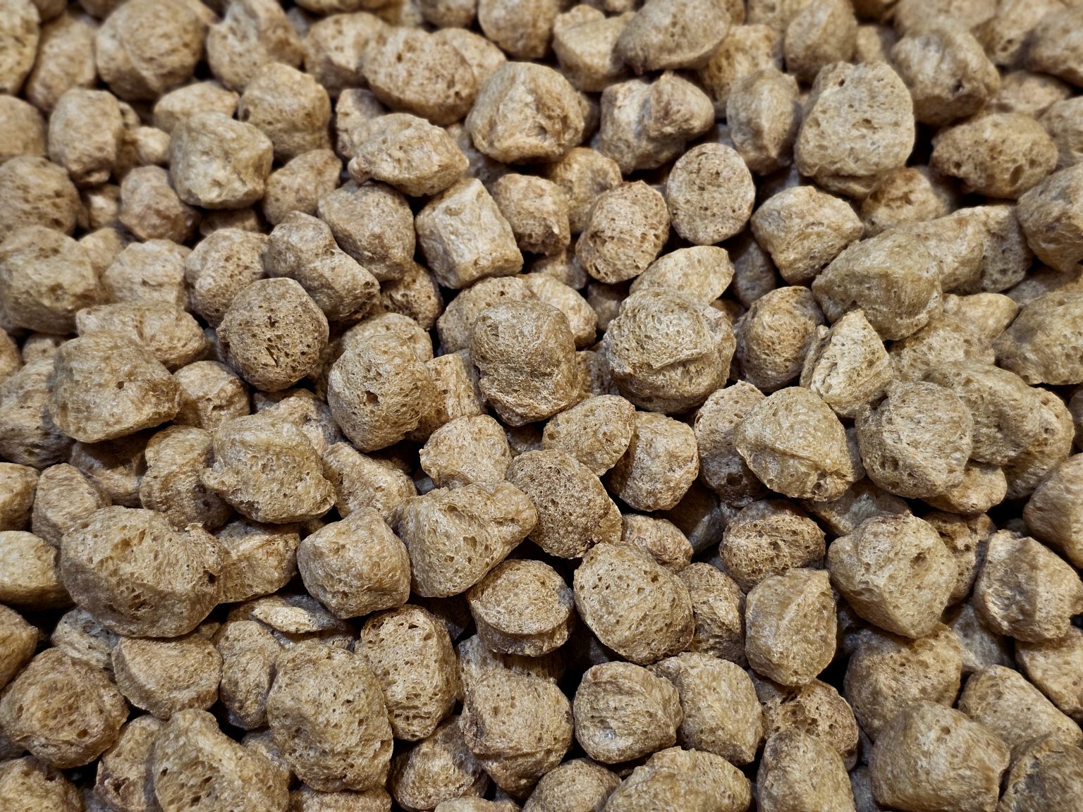 Alternative Text: A detailed close-up of dry soy chunks showing their rough texture and natural brown tones. The repeating shapes create a strong visual pattern, captured indoors in Kozhikode, Kerala, highlighting everyday food ingredients in a simple and artistic way.