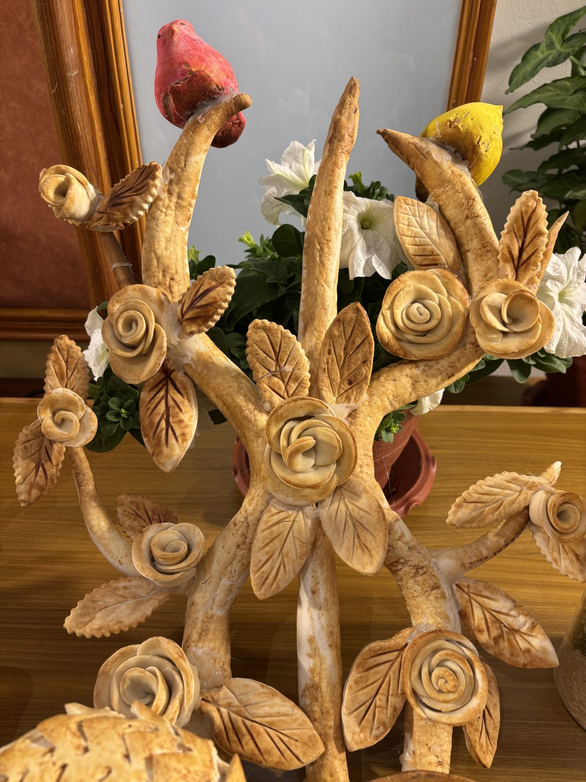 Alternative Text: A decorative display featuring intricately carved branches and flowers made from a light-colored material.