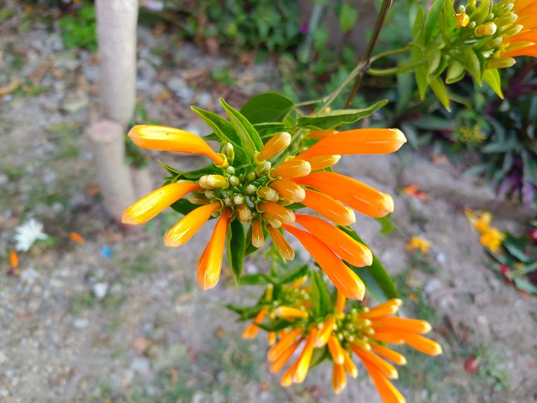 Alternative Text: A cluster of bright orange tubular flowers with green foliage, set against a blurred background of greenery and a light-colored tree trunk.