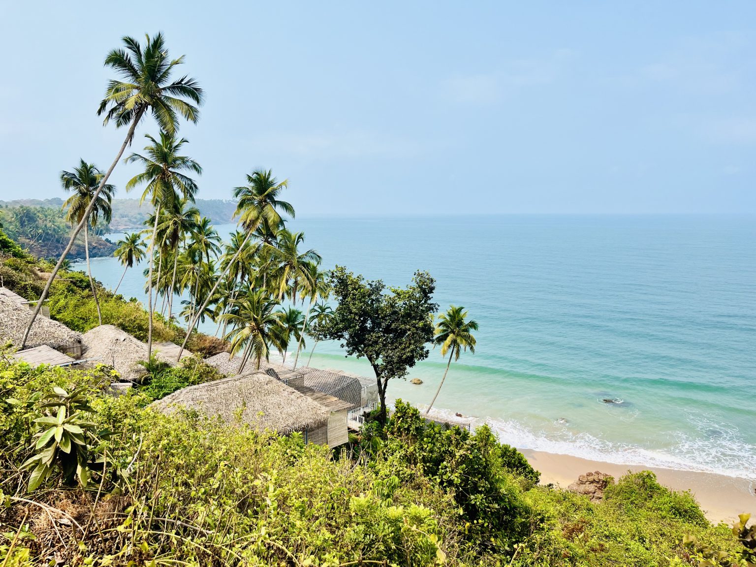 Alternative Text: Tropical beach coastline of Palolem Beach, Goa, India with lush greenery and palm trees overlooking a turquoise sea under a clear blue sky.