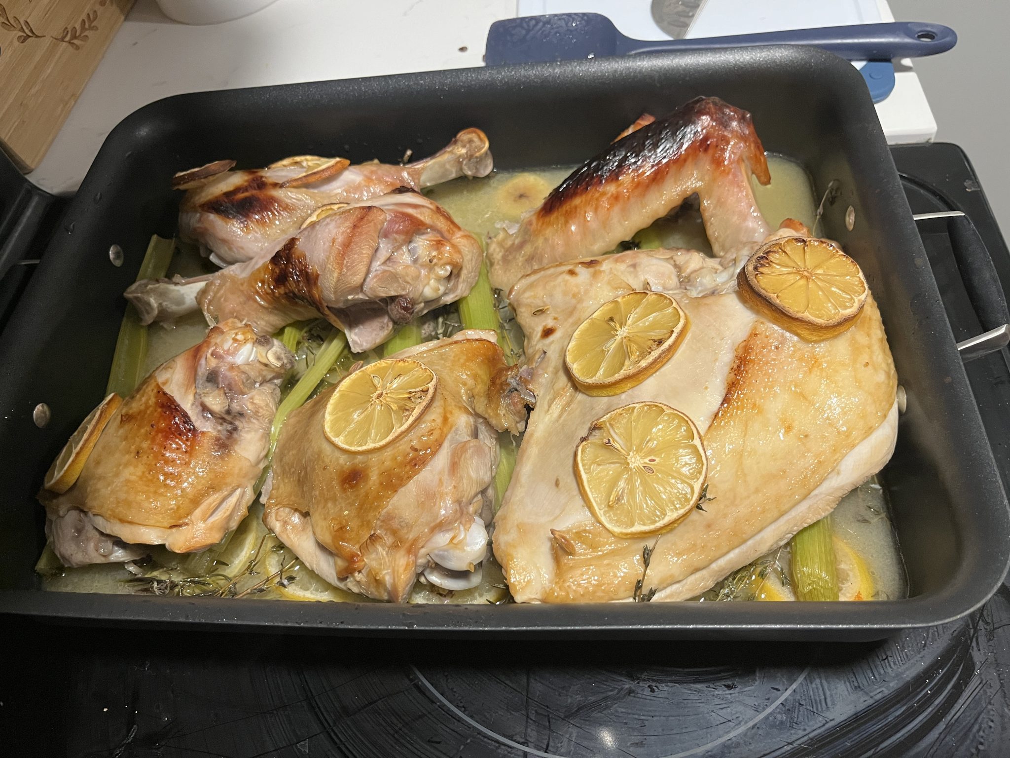 Alternative Text: Turkey in a pan, right after coming out of the oven. Covered in lemon slices.