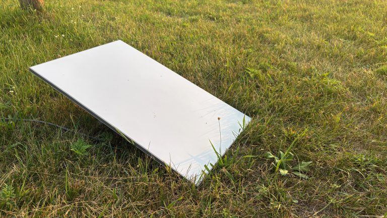 Alternative Text: A rectangular satellite receiver on the grass, pointed at the sky.