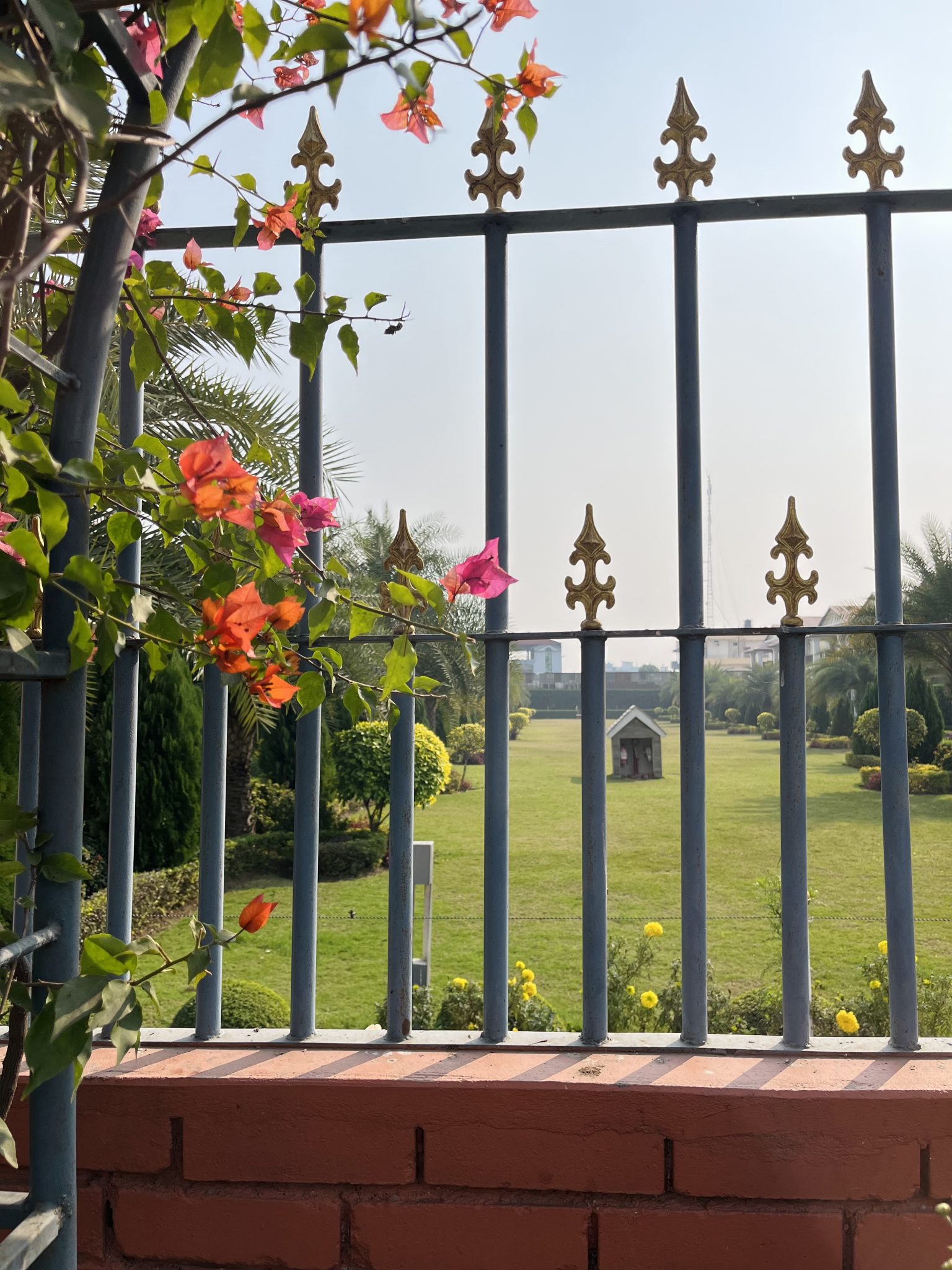 Alternative Text: A view through a wrought-iron fence with colorful bougainvillea, showing a neat garden beyond.