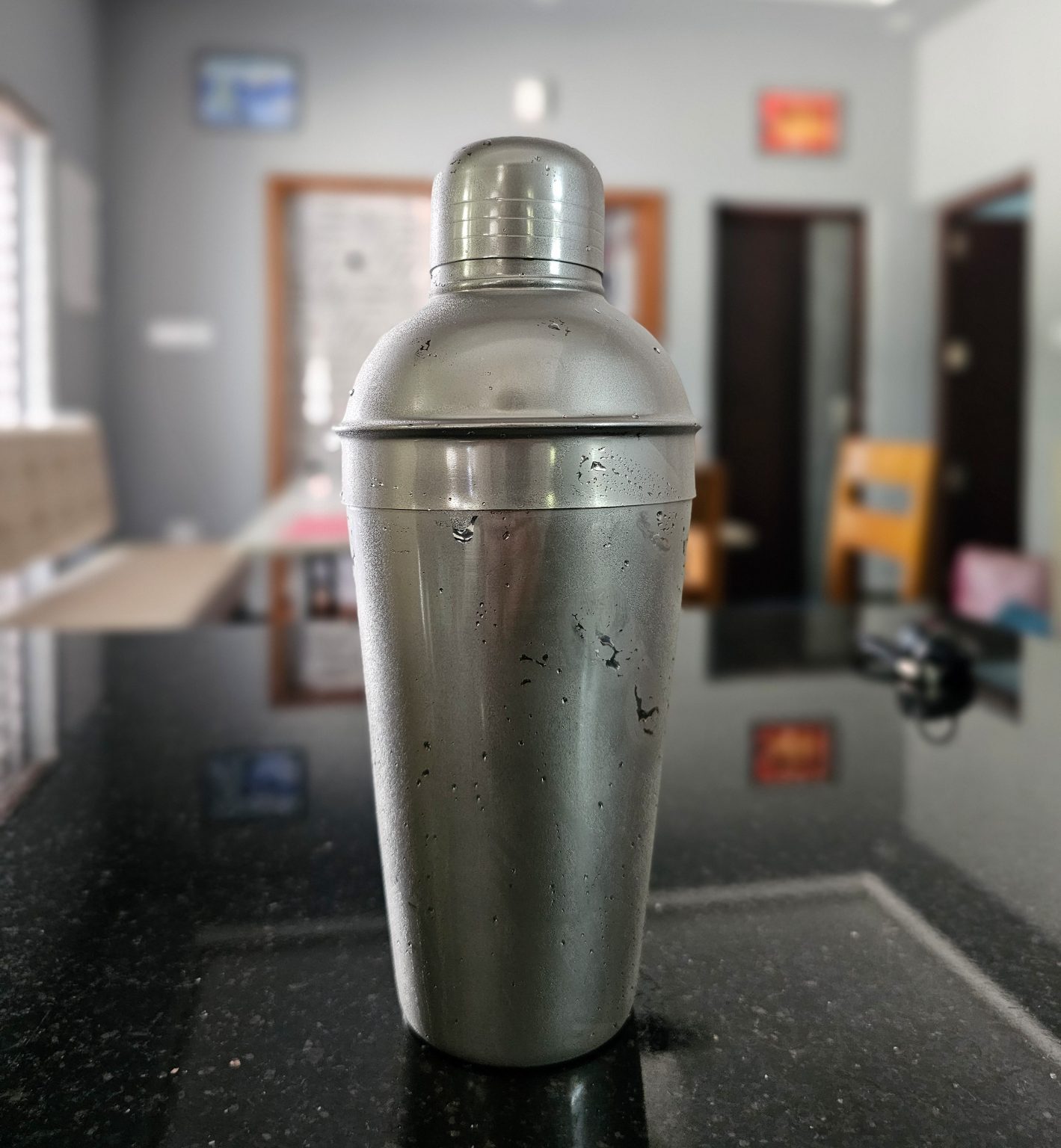 Alternative Text: Frosted steel cocktail shaker on a granite countertop.
