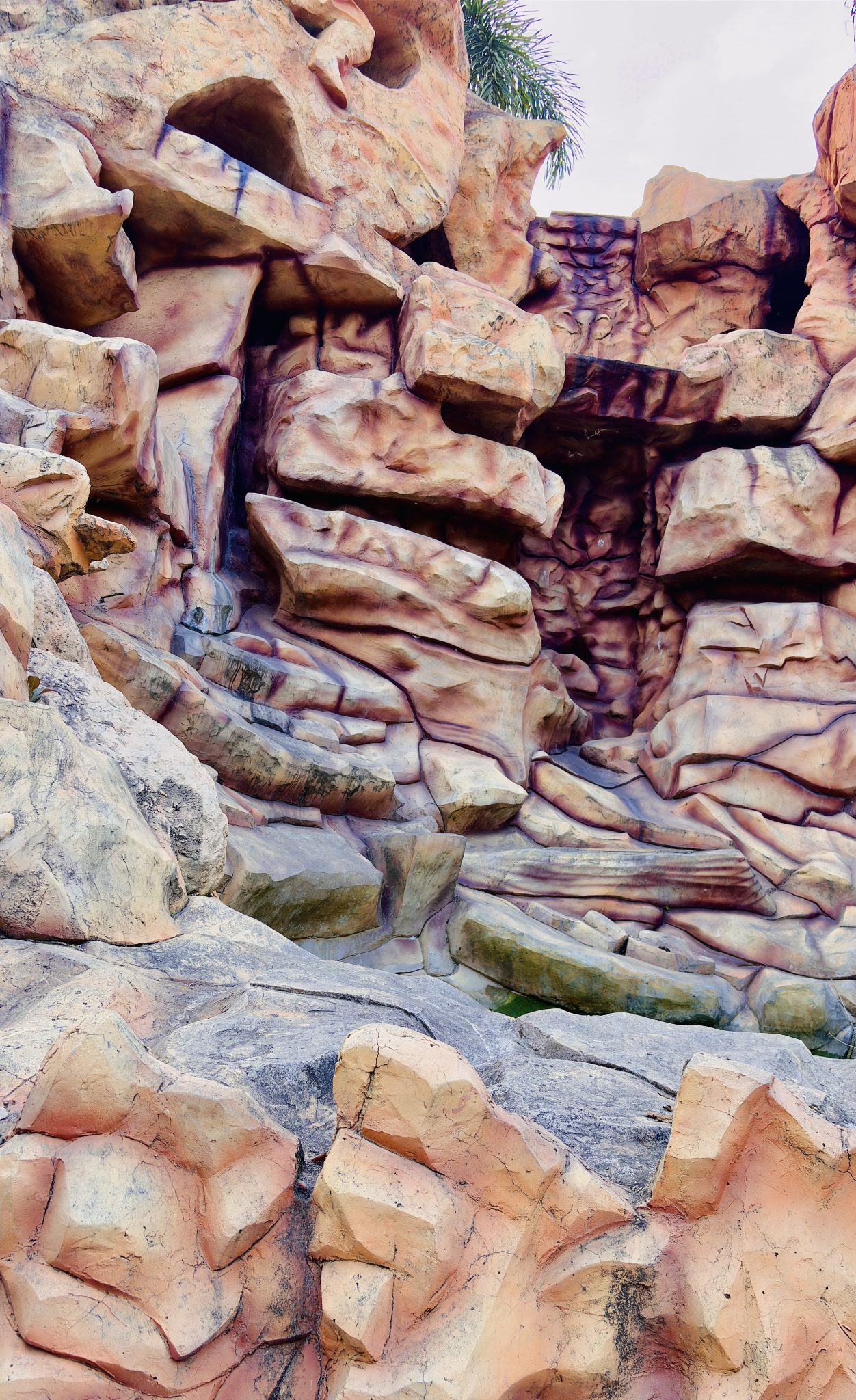 Alternative Text: Artificial rock formation resembling rugged canyon cliffs with layered textures in shades of red, orange, and beige, suggesting a stylized desert landscape.