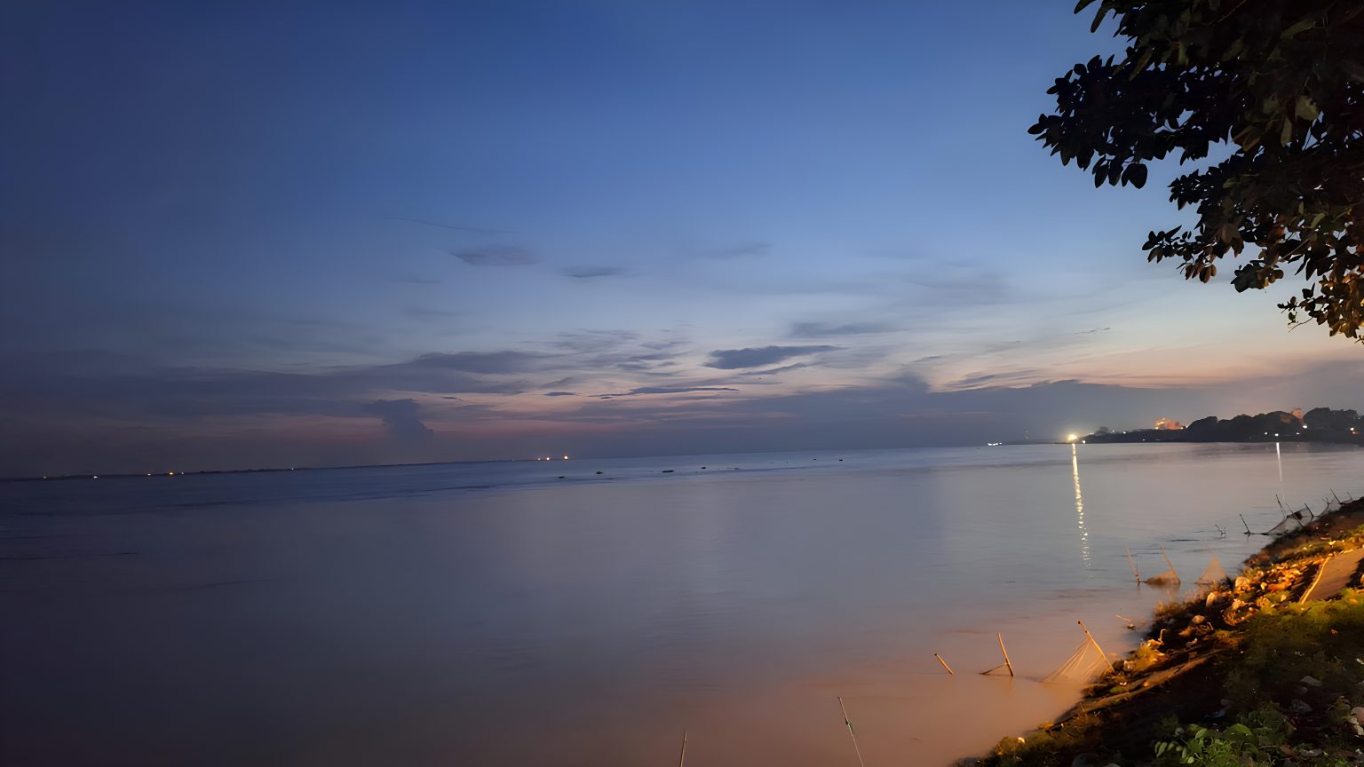 Alternative Text: The vast Padma River at twilight, showing the reflective water and the silhouetted riverbank with distant city lights glowing under a blue and purple gradient sky.