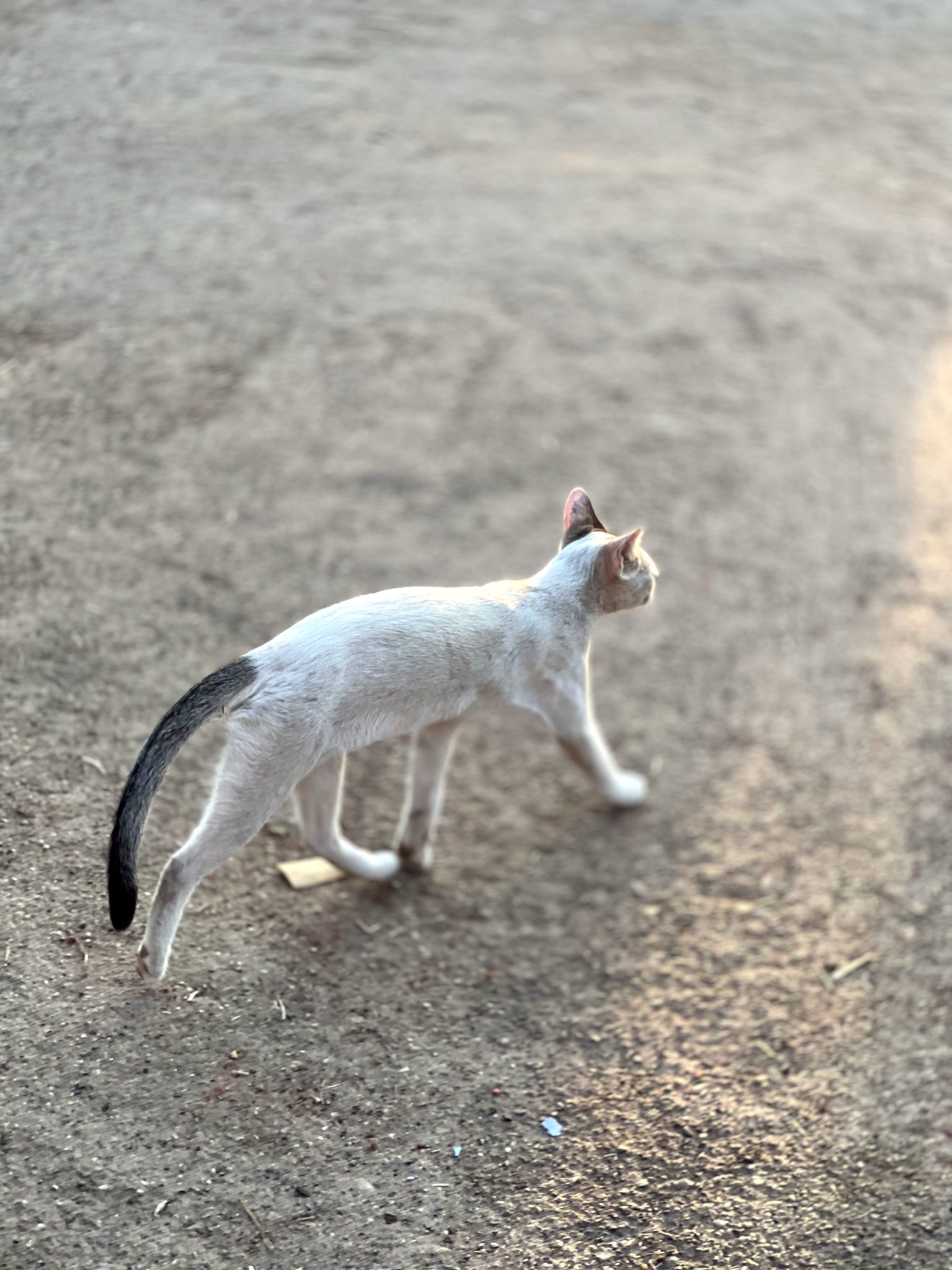 Alternative Text: A light-colored cat with a dark-tipped tail walks along a dirt path, seen from the side.
