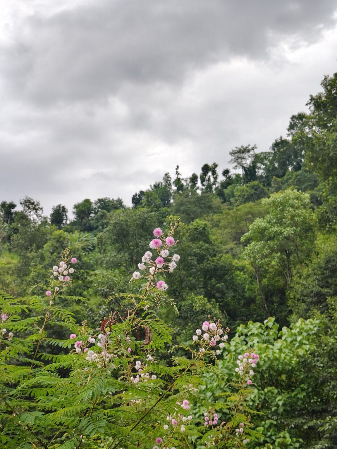 Alternative Text: A lush green landscape under a cloudy sky, featuring flowering plants with clusters of pink and white blossoms in the foreground.