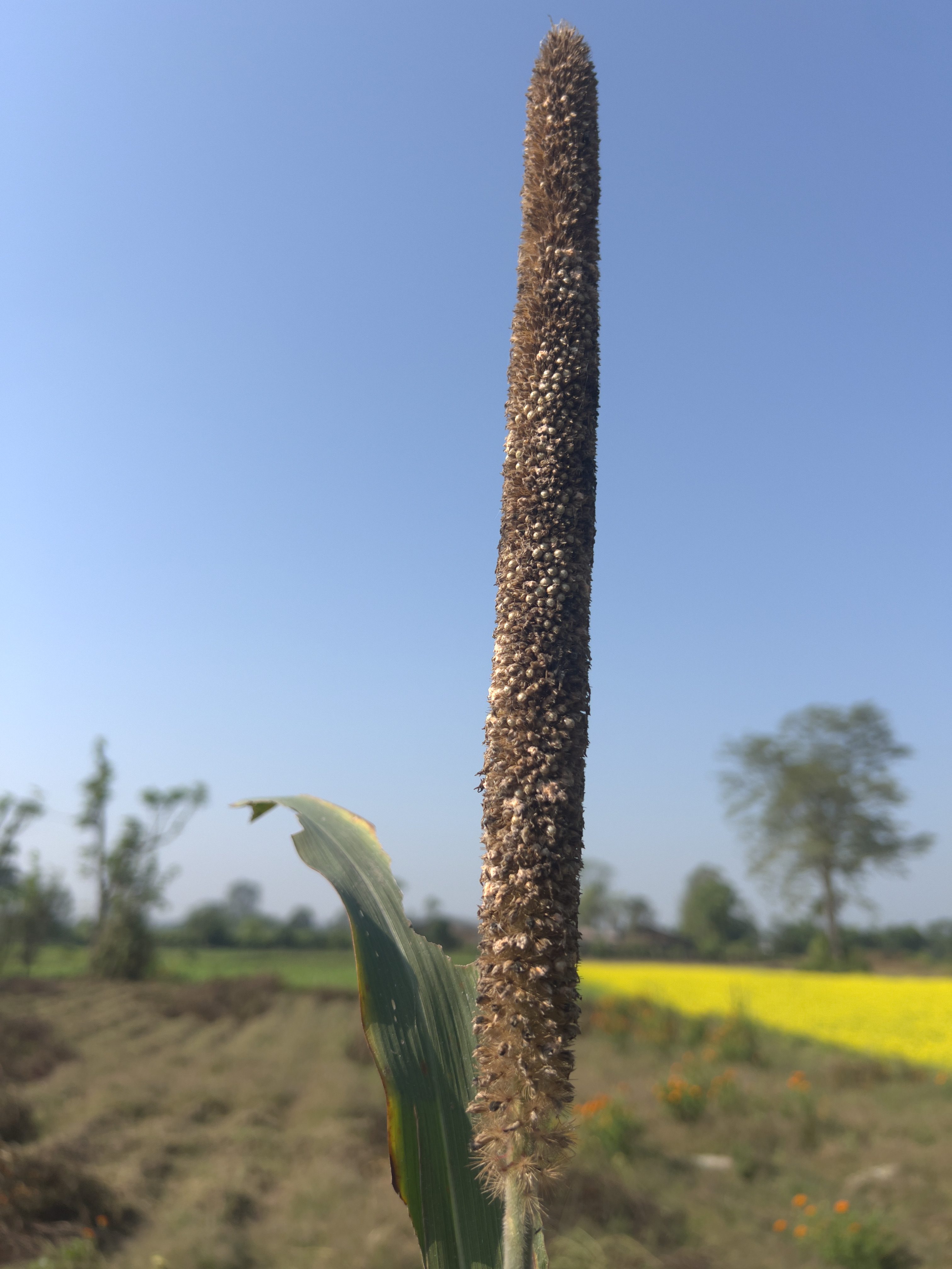 Alternative Text: Pearl millet with full seeds against a mustard field and bare land in Chitwan.