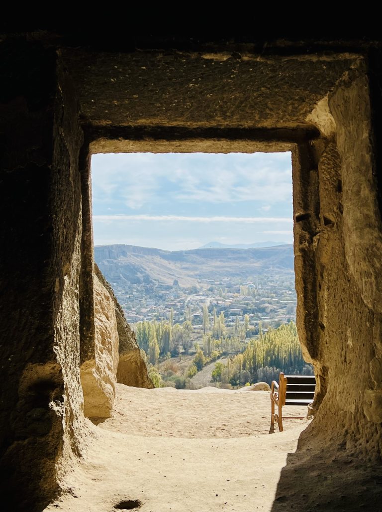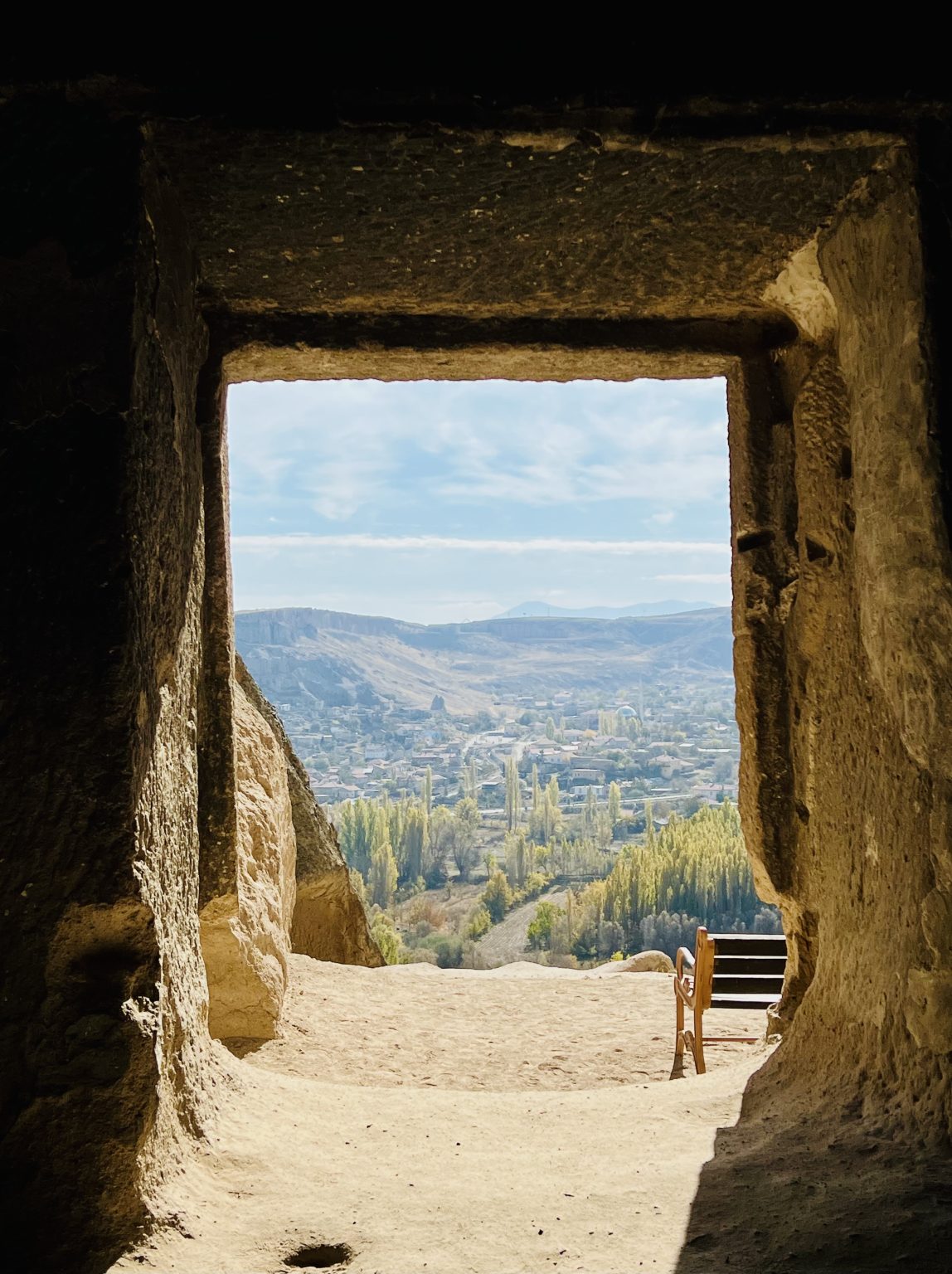 Alternative Text: A view of the valley and a distant town, seen from inside a cave through a rectangular opening, at Cappadocia, Turkey.