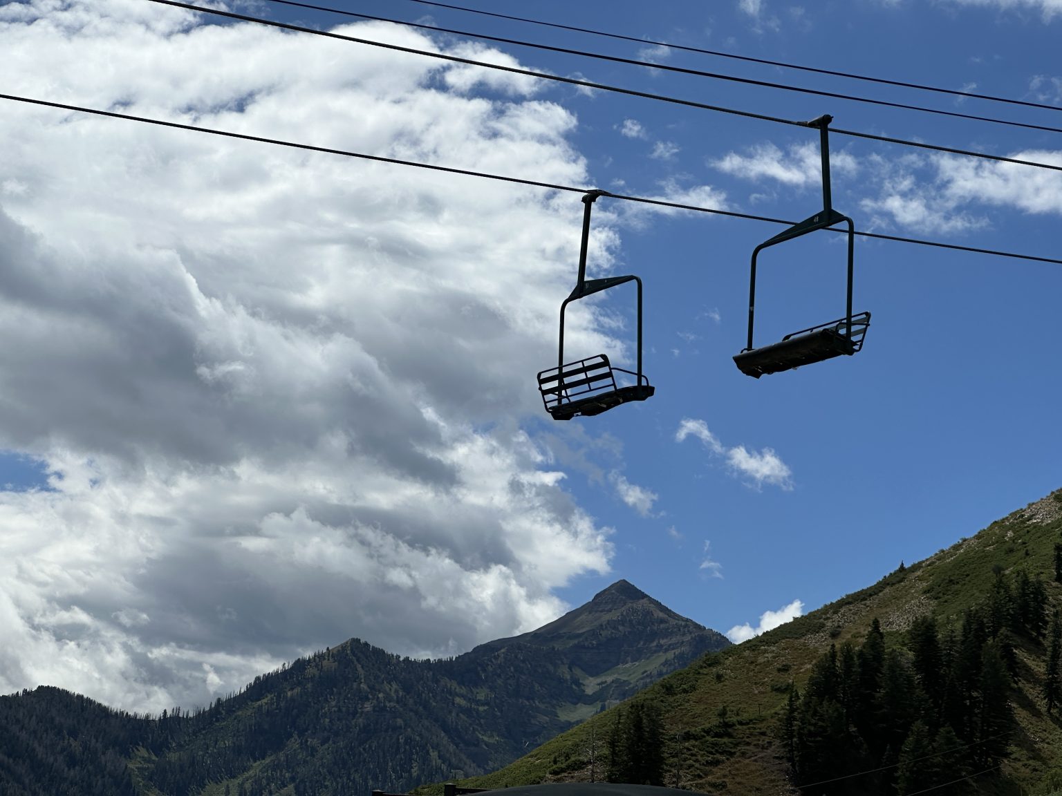 Alternative Text: Ski lift during the summer with mountains and a cloudy sky in the background.