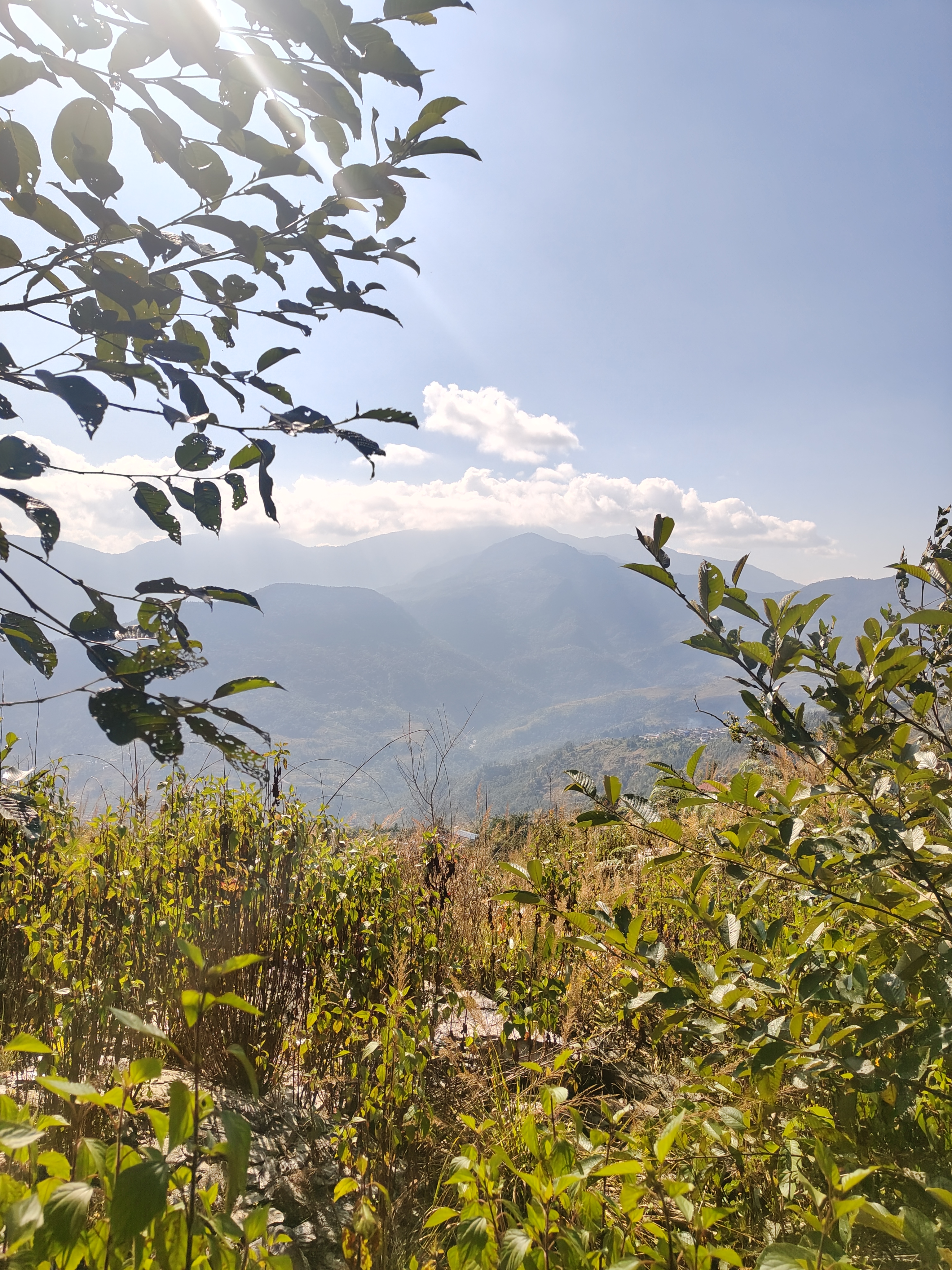 Alternative Text: A mountainous landscape is partially framed by green leaves and plants. The scene features a clear blue sky with a few clouds and sunlight illuminating the area.