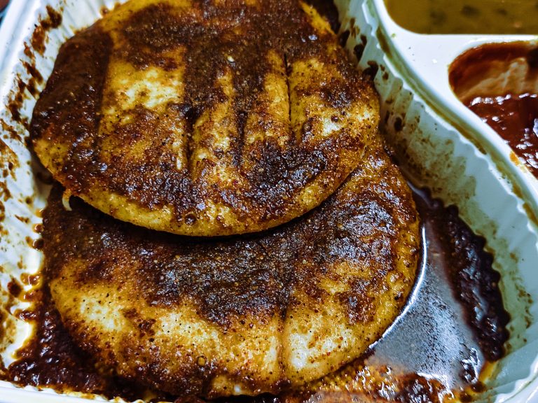 Alternative Text: Two crispy Podi Idli butter with dark sauce.