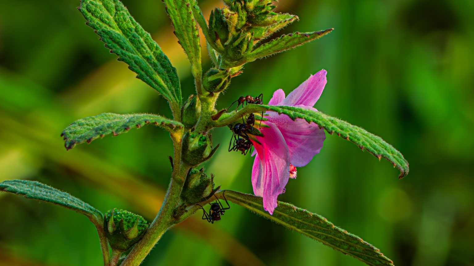 Alternative Text: Ants crawling on a light pink flower and its green hairy stem.