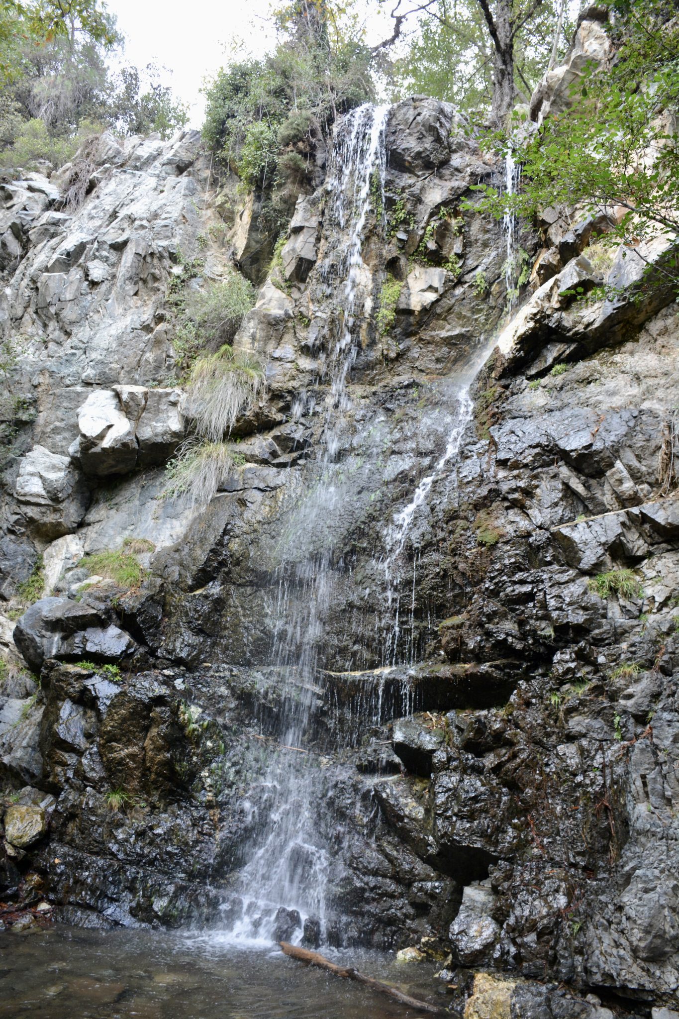 Alternative Text: Caledonia Waterfalls in the Troodos Mountains cascade down a rocky cliff into a clear, tranquil pool surrounded by greenery.