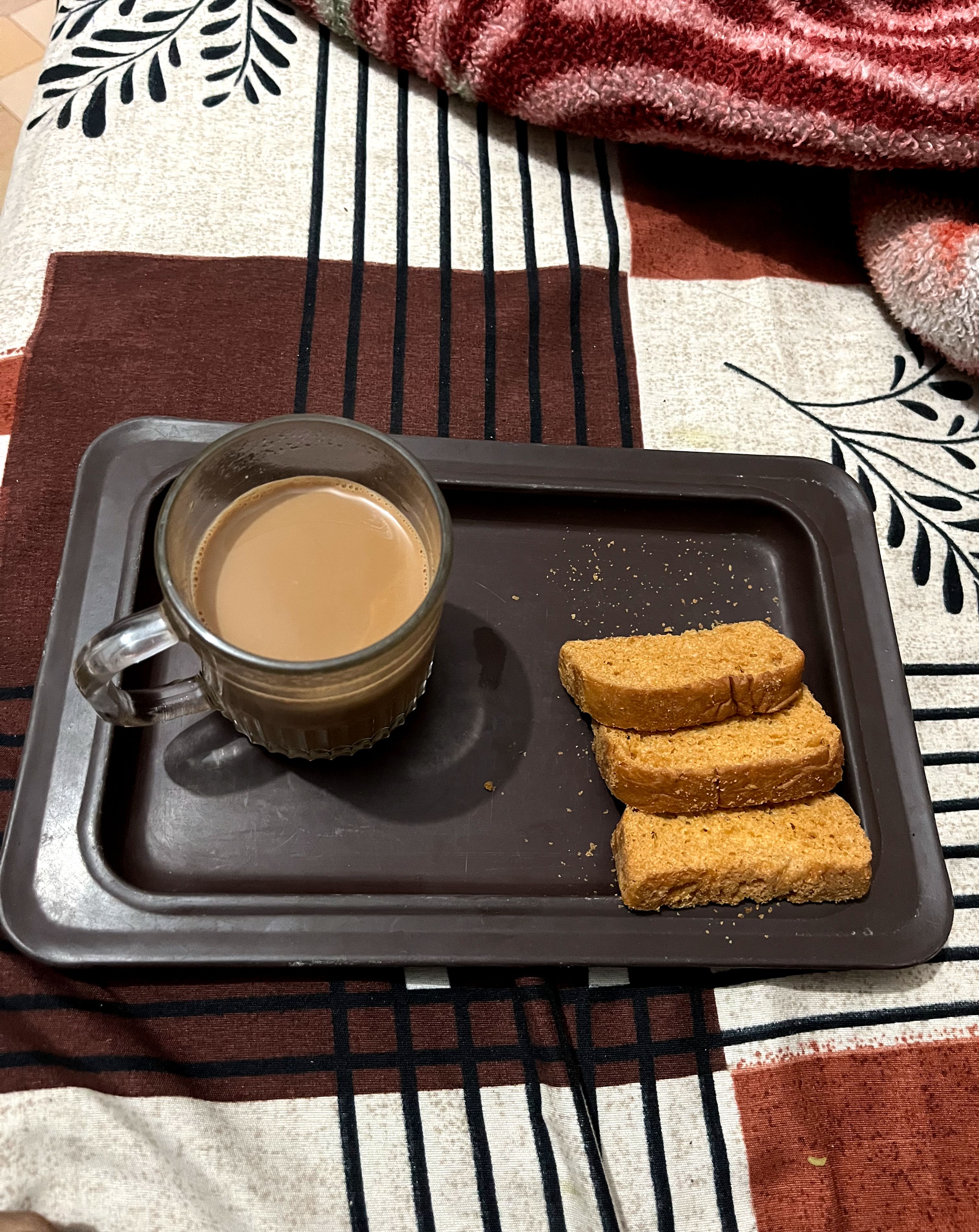 Alternative Text: A brown tray holds a glass of tea and three pieces of golden-brown biscuit on a patterned tablecloth.