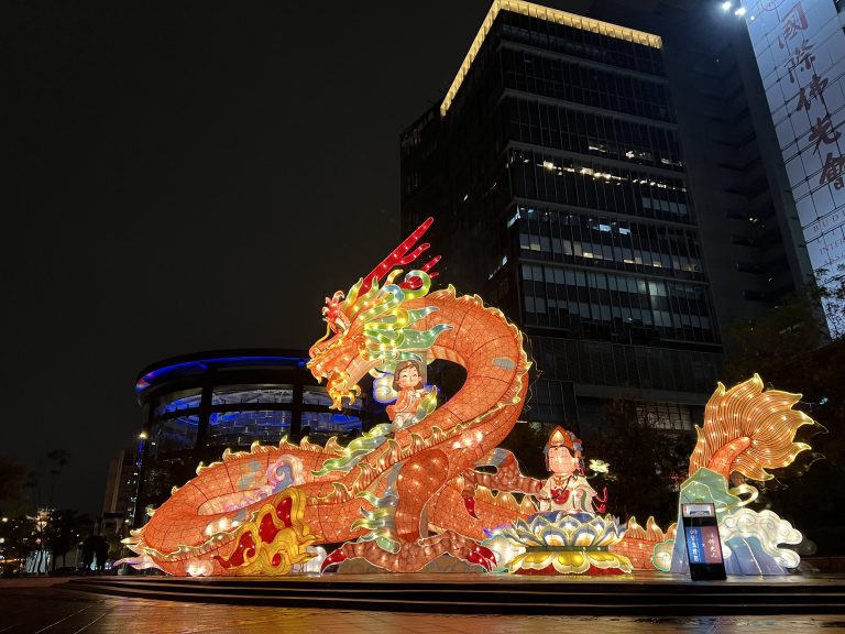 Alternative Text: A large, illuminated dragon lantern with two figures riding on it, set up at night in an urban plaza with a modern building in the background from Taiwan