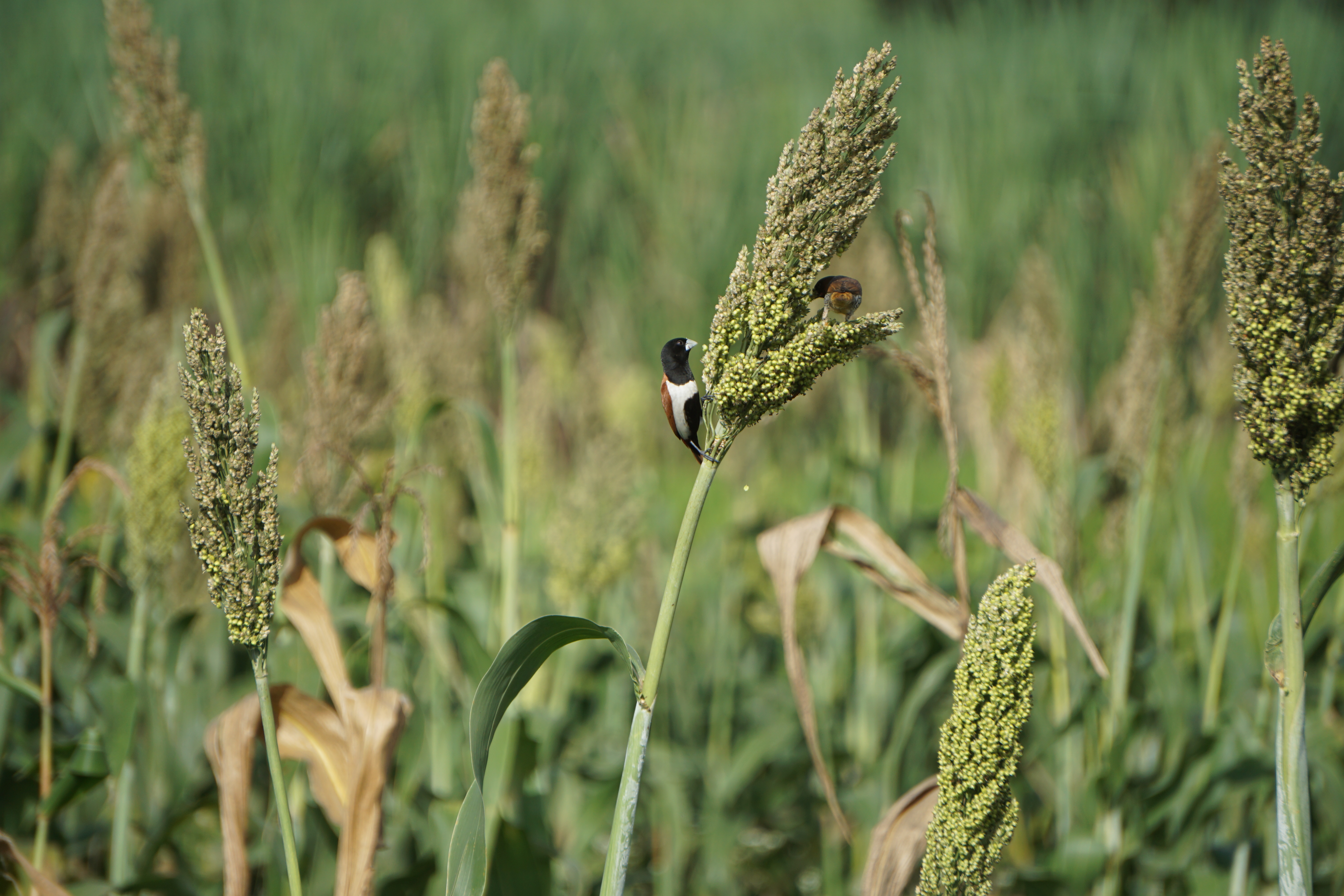 Alternative Text: A close-up of a tall grain plant with two small birds perched on its head—one black and white, the other brown—set against blurred green fields.