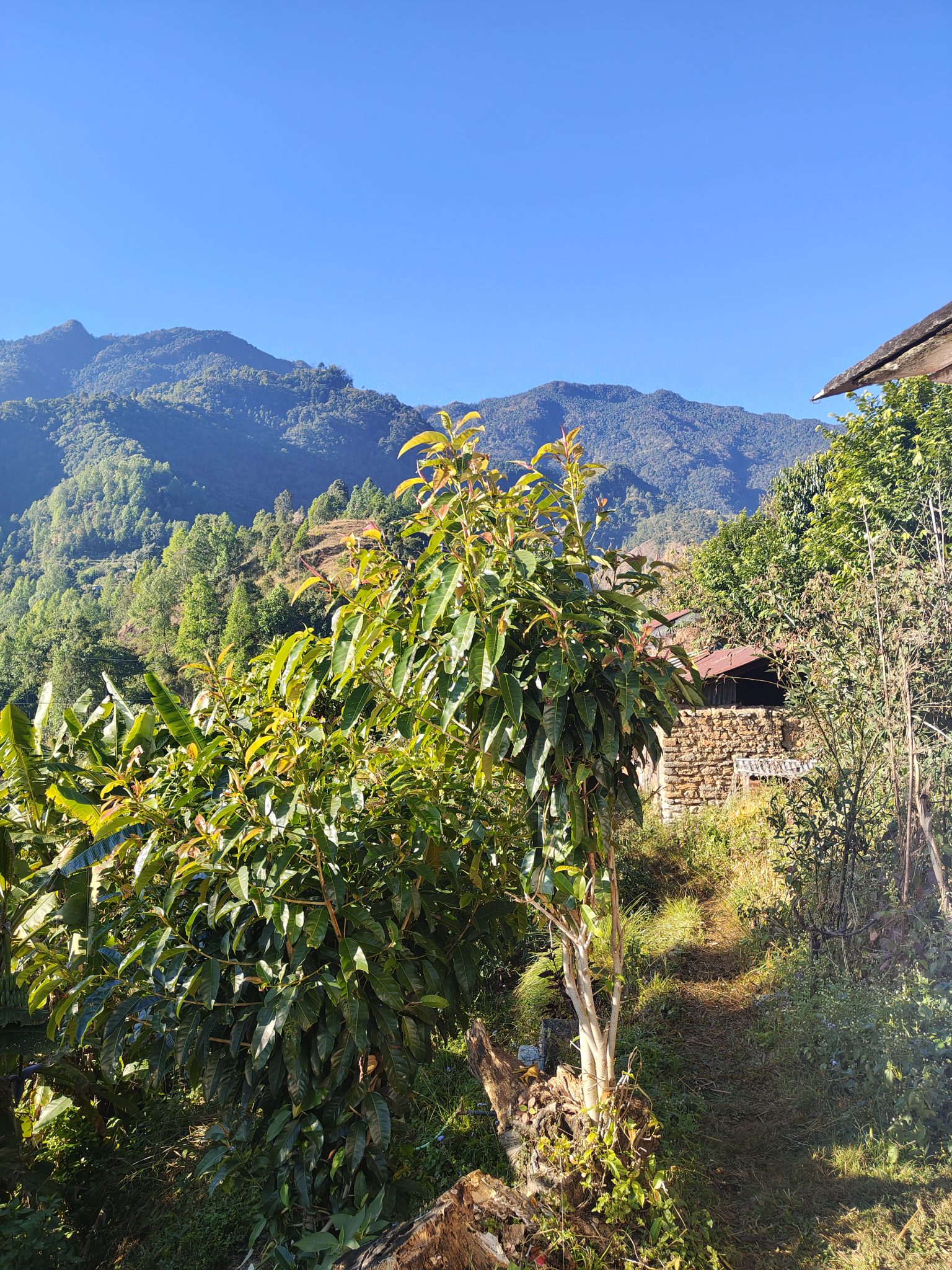 Alternative Text: A scenic view of a mountainous landscape under a clear blue sky.