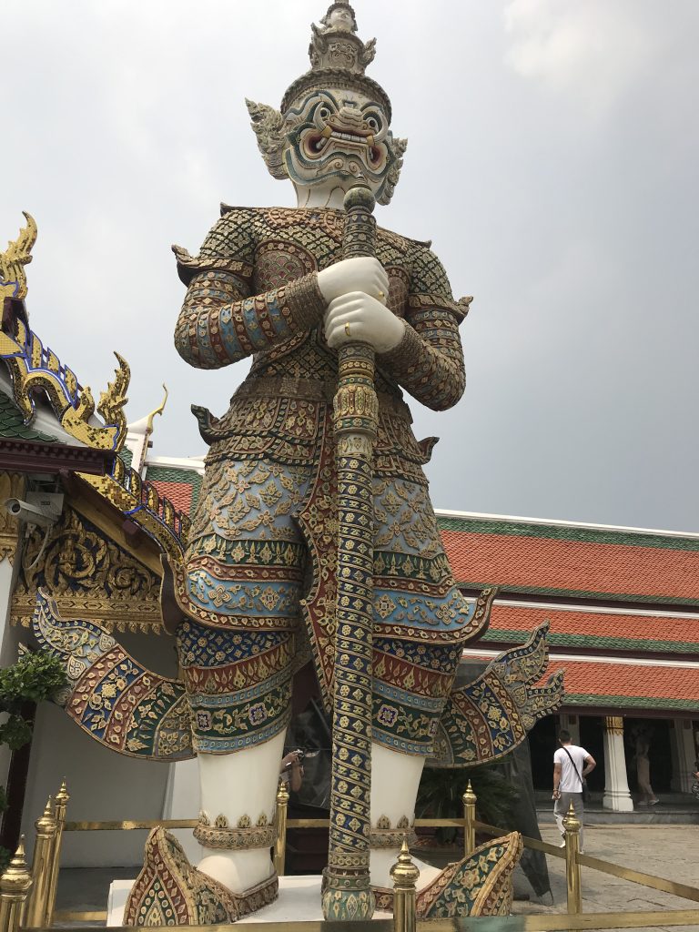 Alternative Text: A low-angle shot of a tall, intricate statue of a yaksha (a giant or mythical being) with a colorful ornate costume. The statue is standing guard in front of a building with a red tile roof.