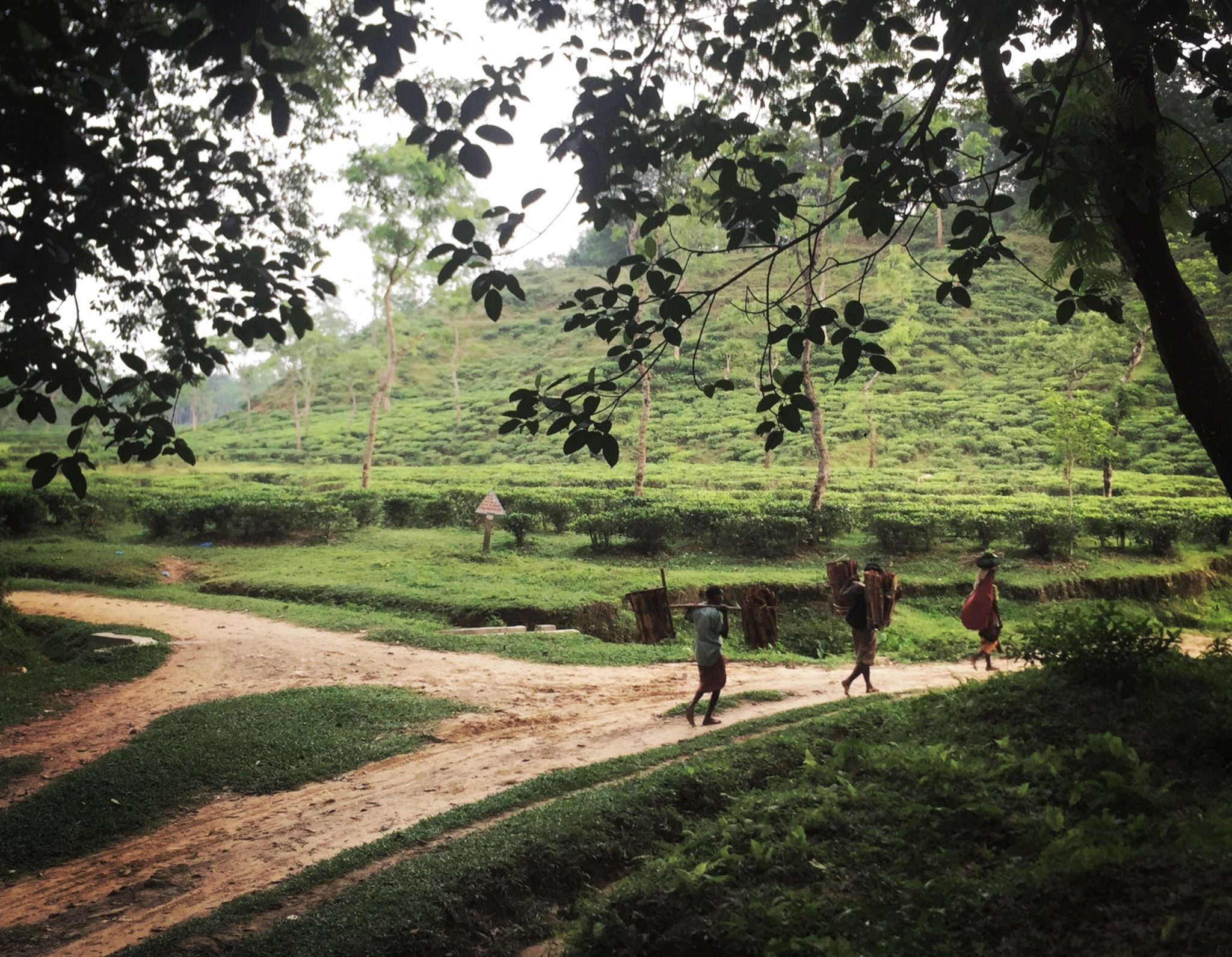 Alternative Text: A winding dirt path leads through lush green tea plantations. In the foreground, three figures carry bundles on their shoulders, walking along the path. Trees and foliage frame the scene, with hills rising gently in the background