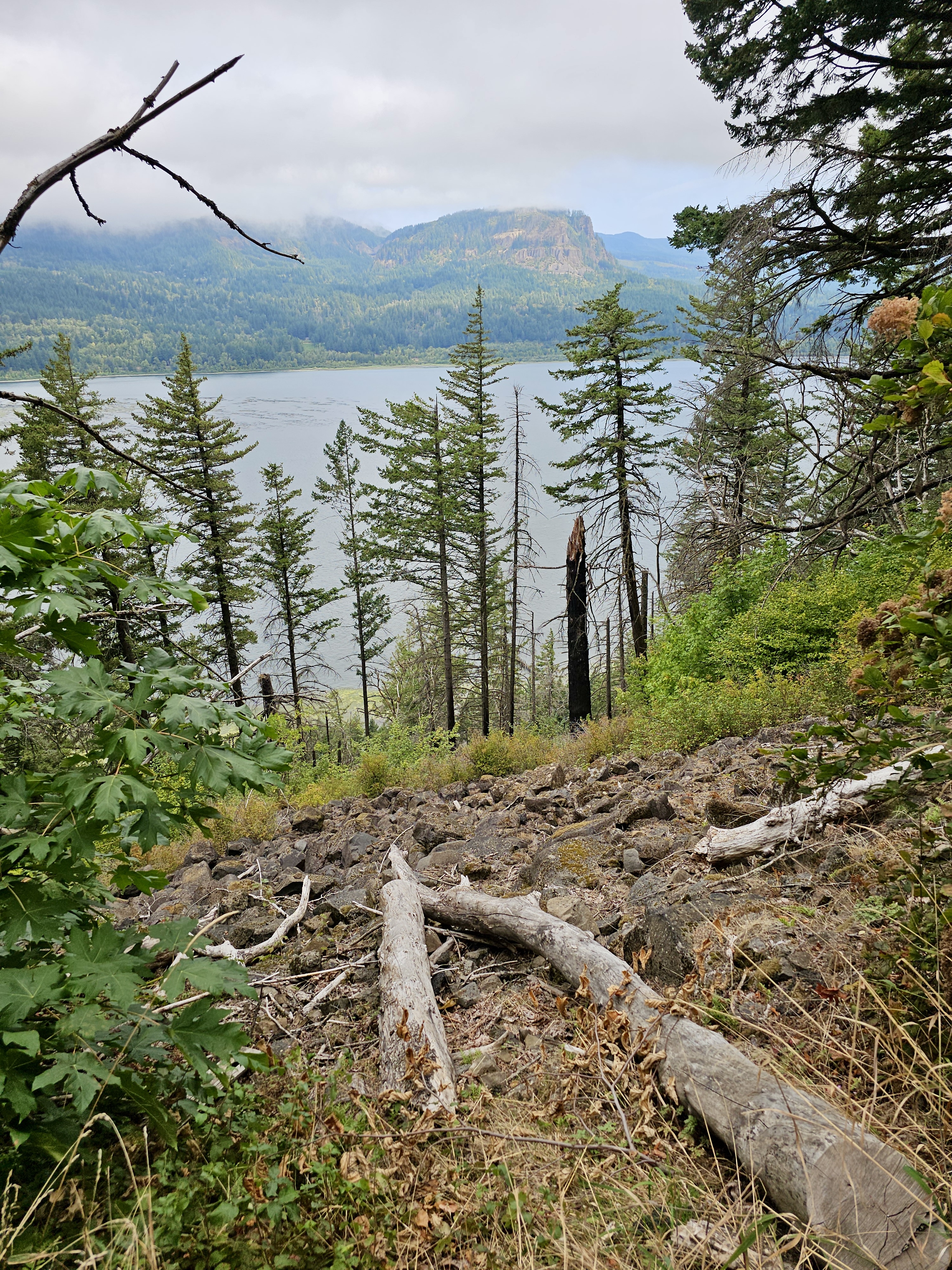 Alternative Text: Looking down a rocky slope in the Columbia River Gorge National Scenic Area, Oregon, with pine trees and a glimpse of the Columbia River in the background.