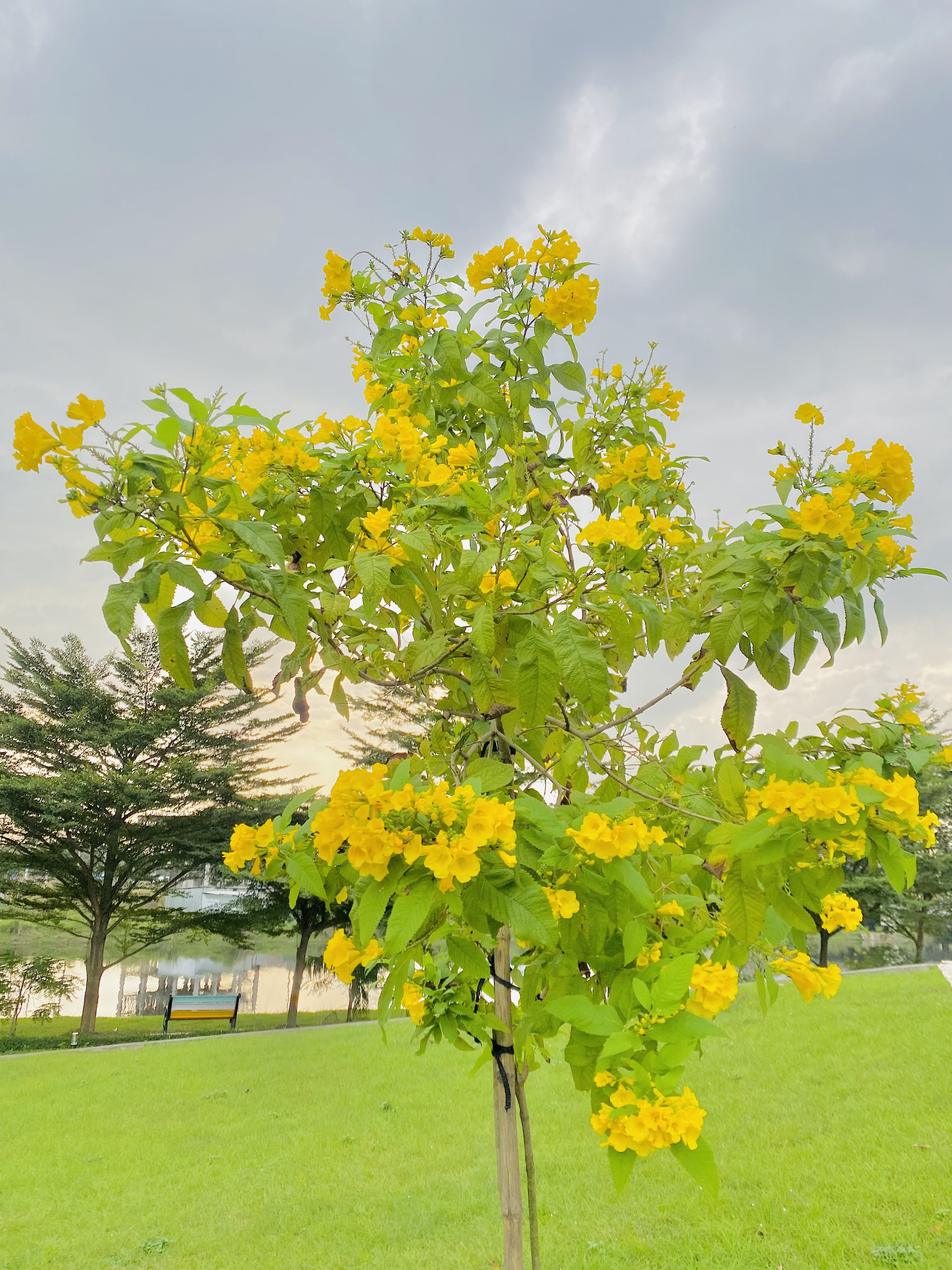 Alternative Text: A yellow flowering tree is prominently displayed in the foreground, featuring vibrant yellow blooms clustered among lush green leaves. In the background, there is a serene landscape with a lake reflecting the sky and nearby trees, as well as a bench along a grassy area.